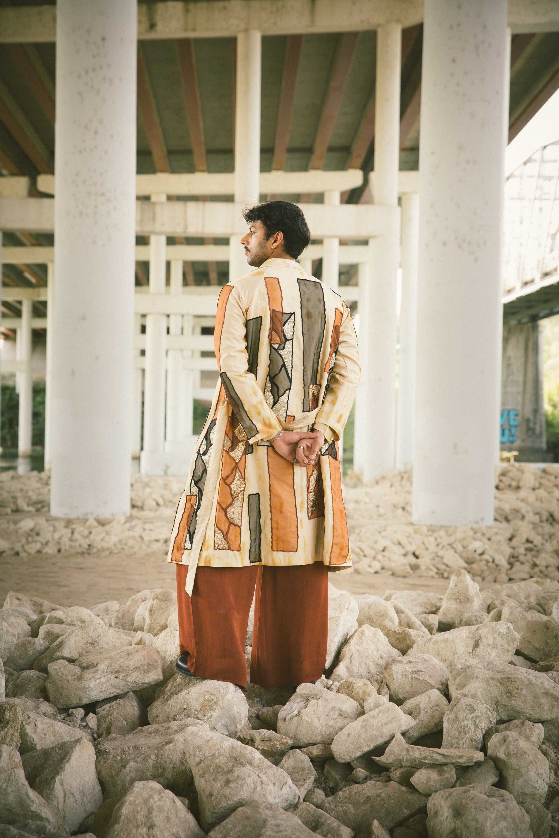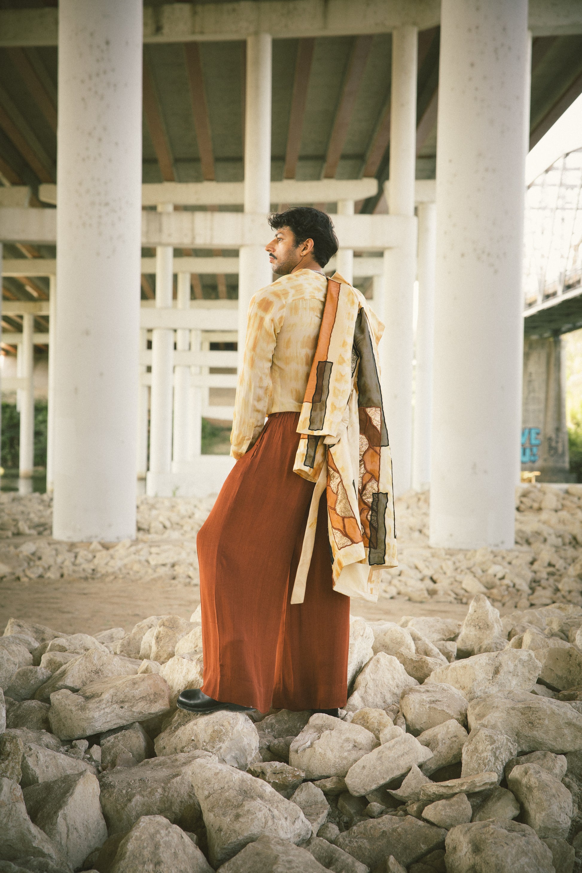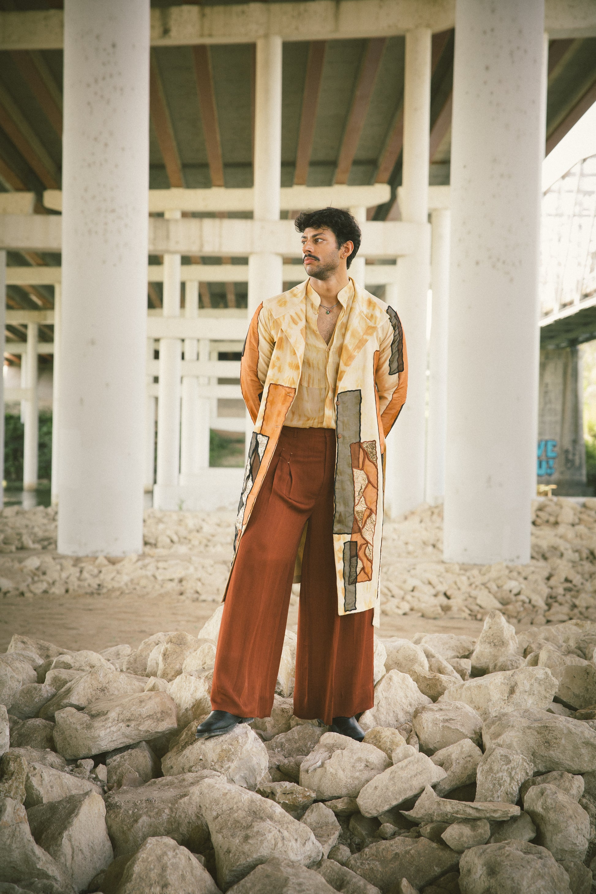 Chai tie-dye trench coat and organza silk shirt with pleated La Haveli signature pant.