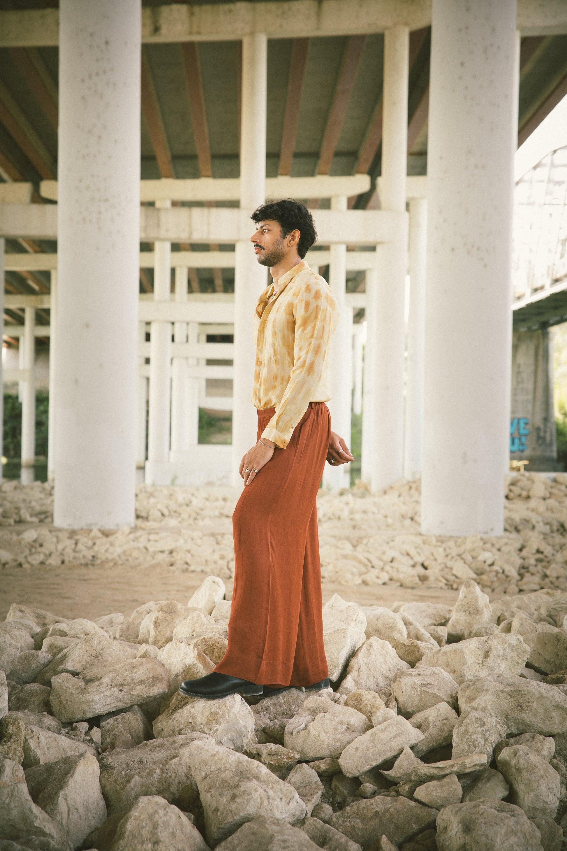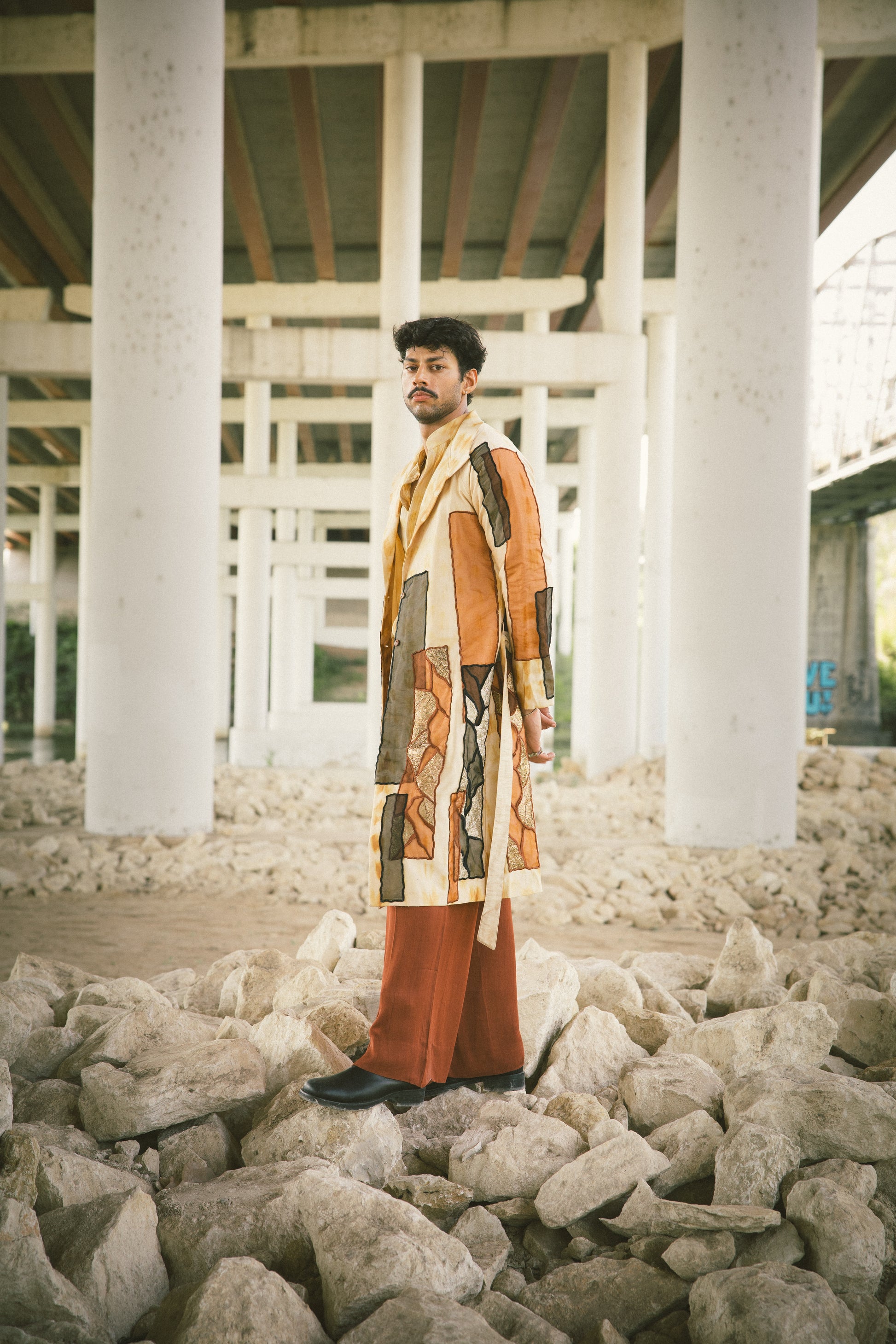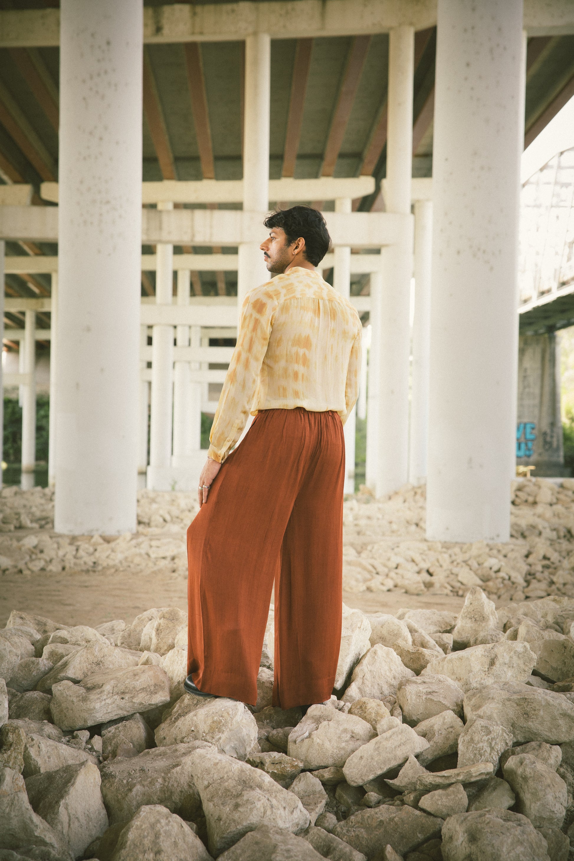 Chai tie-dye trench coat and organza silk shirt with pleated La Haveli signature pant.