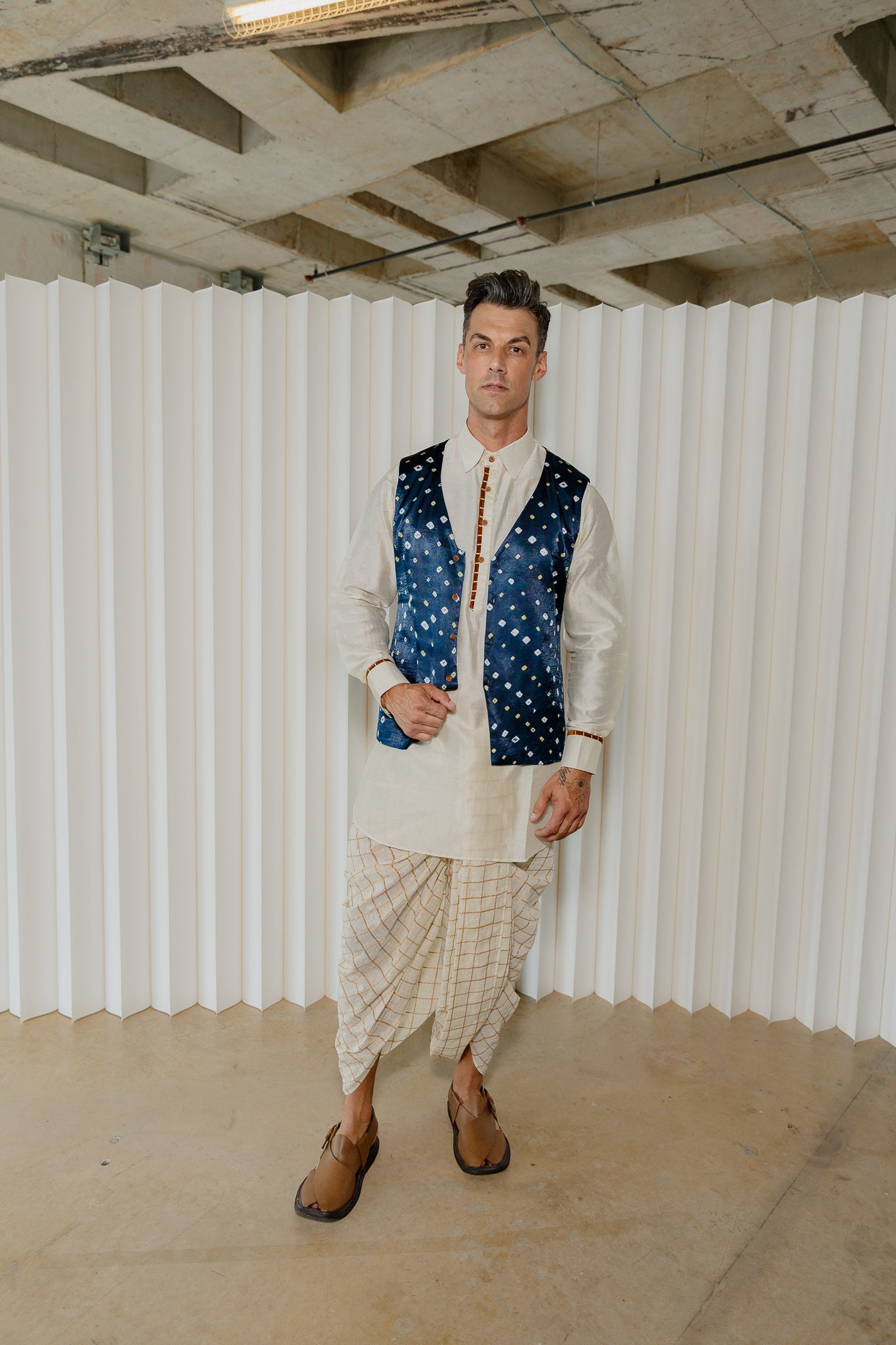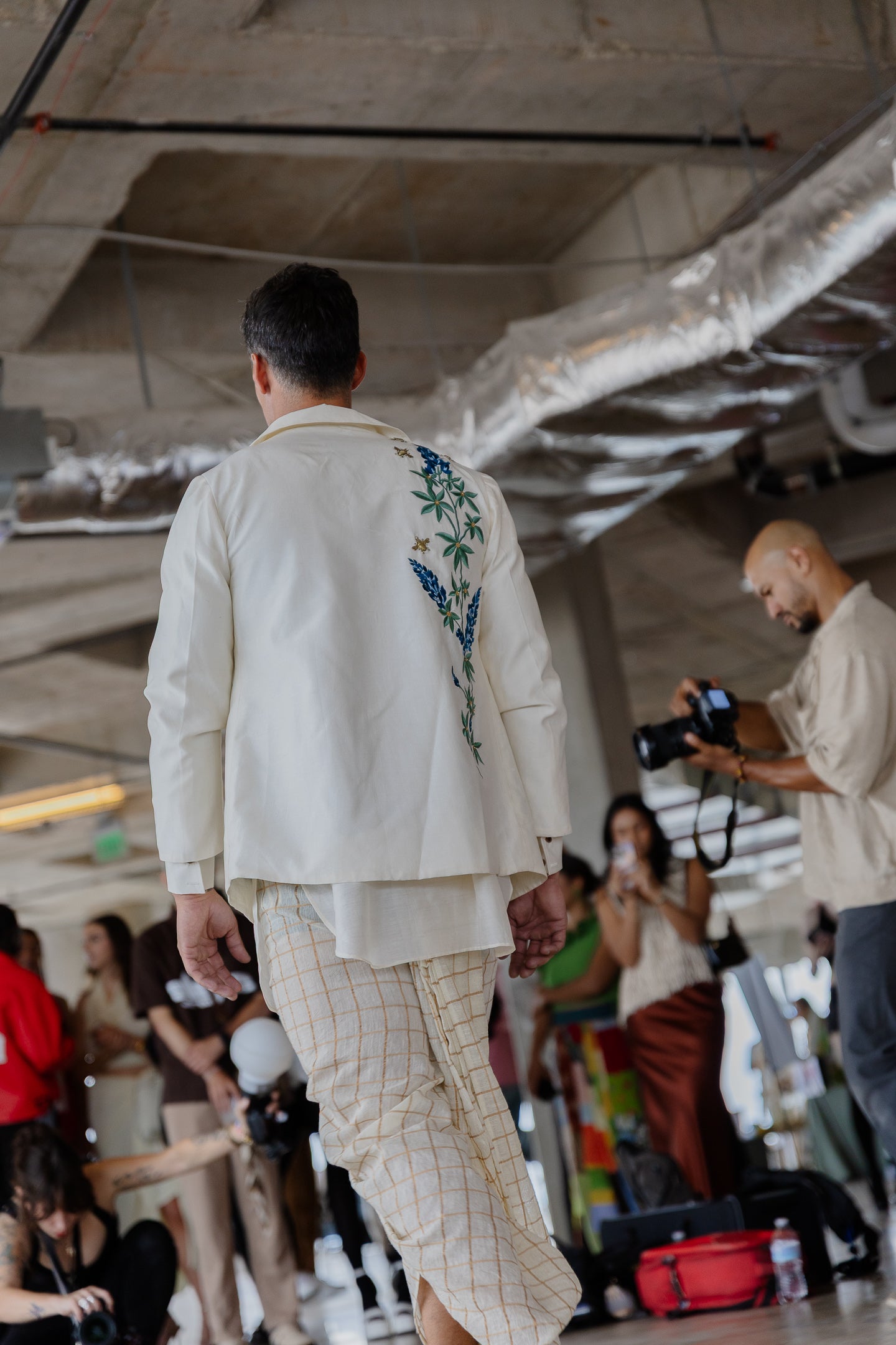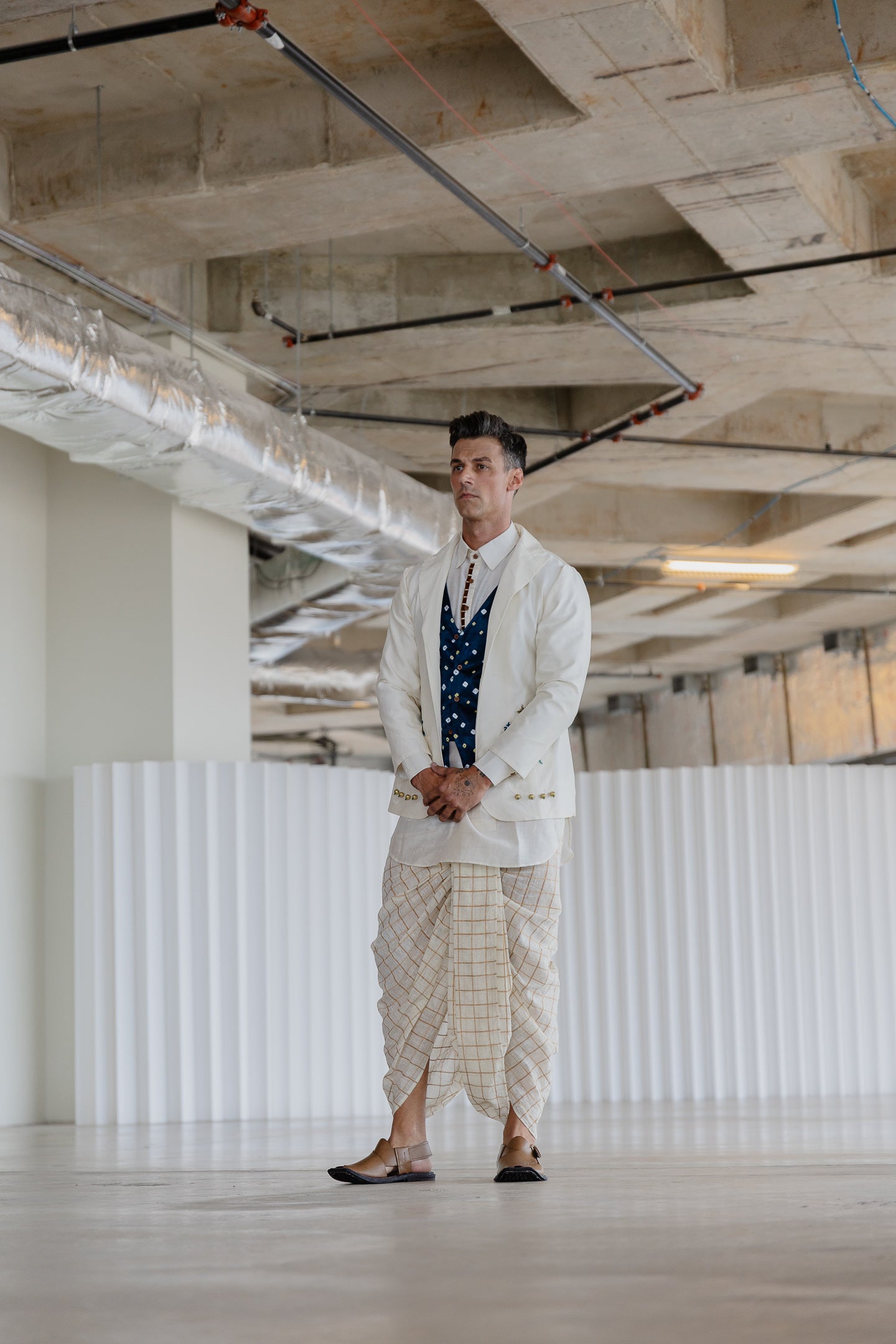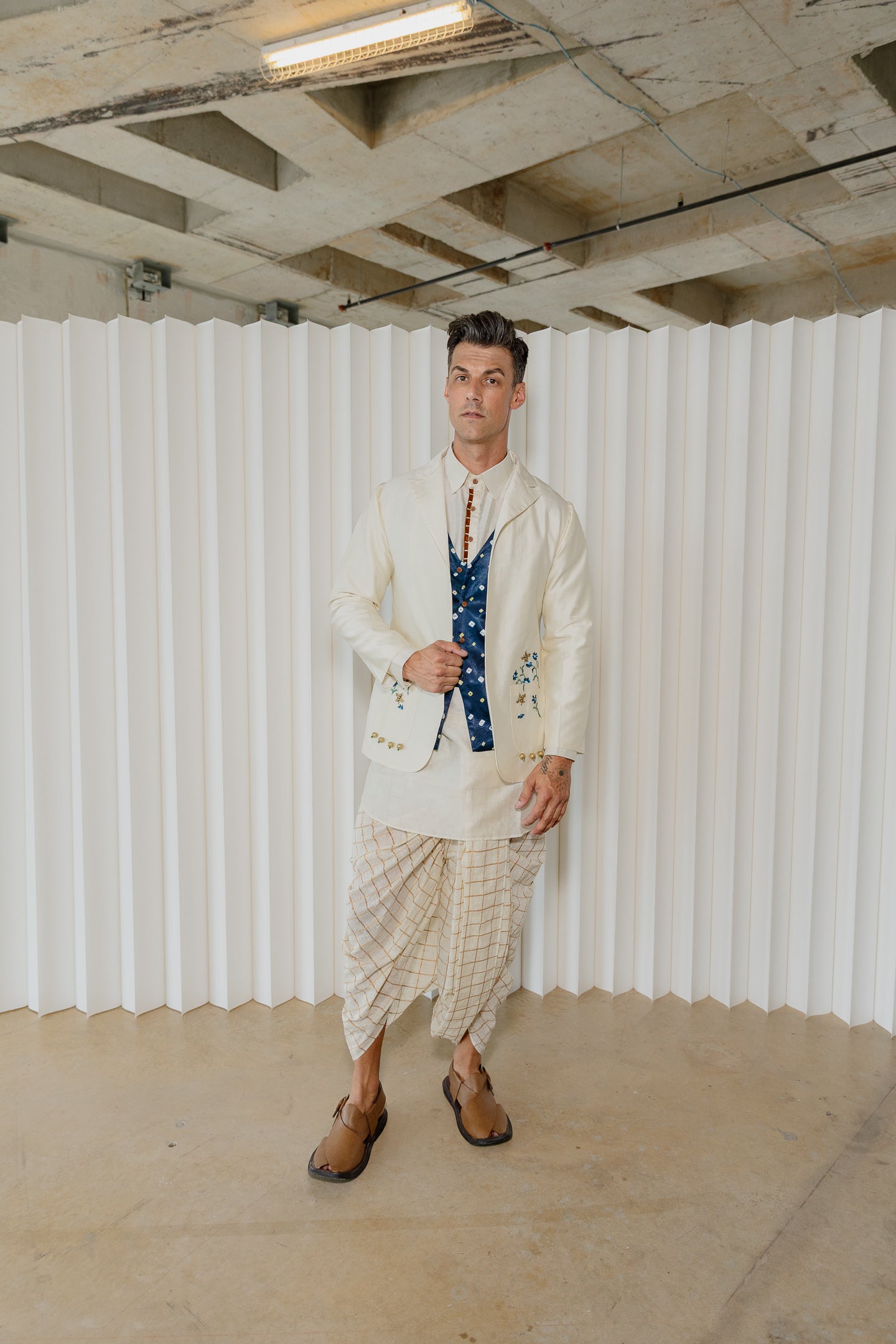This 4 piece set is inspired by the Texas Bluebonnet flower. The embrodiered suit jacket is accents with a traditional bandhani vest and paired with a playful dhoti.