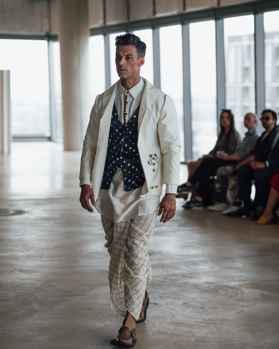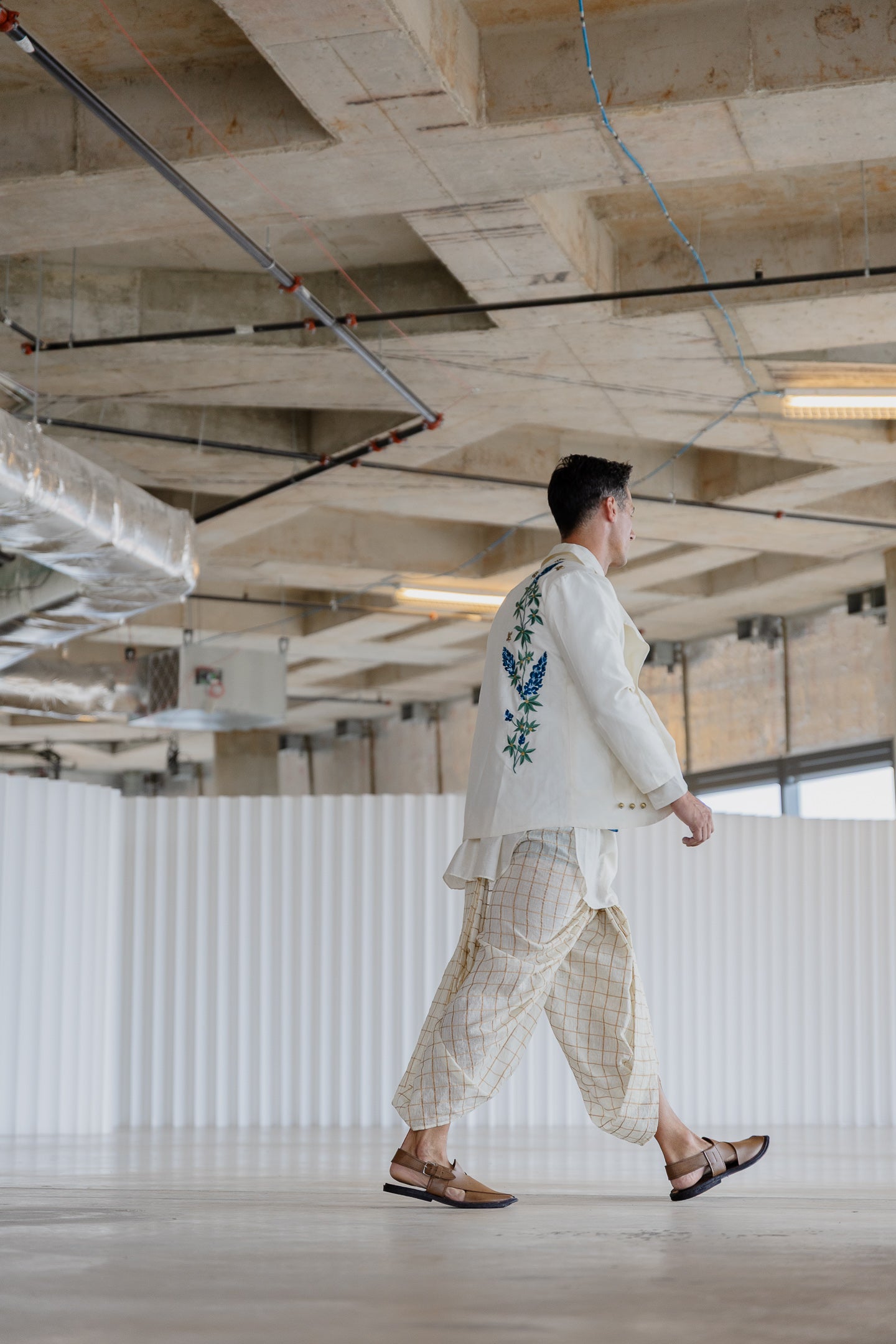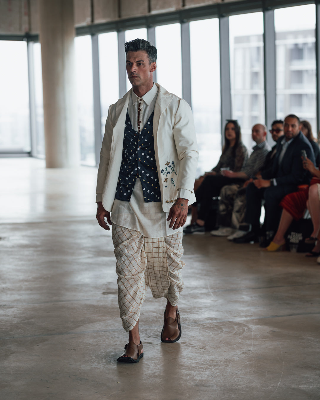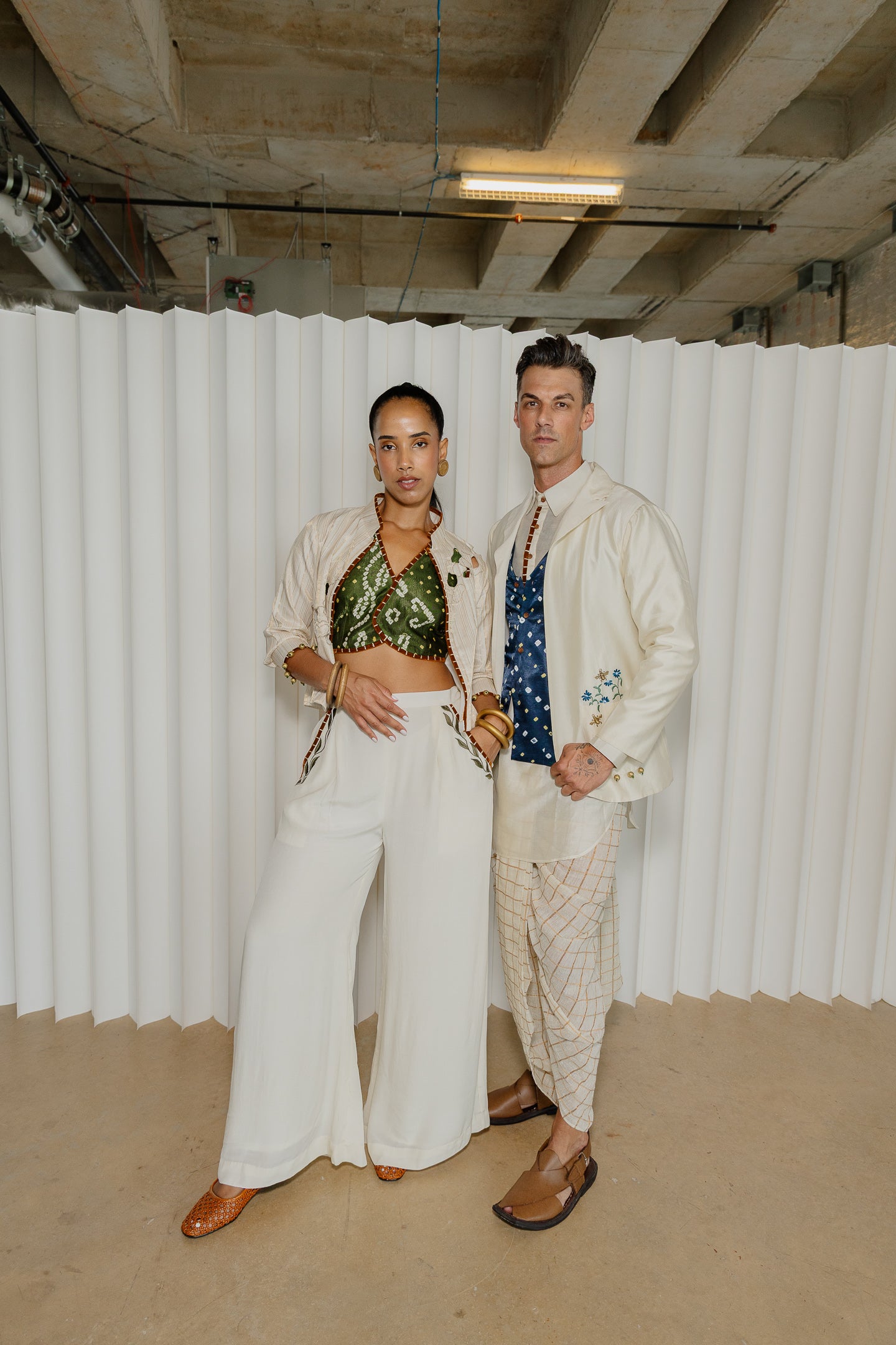 This 4 piece set is inspired by the Texas Bluebonnet flower. The embrodiered suit jacket is accents with a traditional bandhani vest and paired with a playful dhoti.