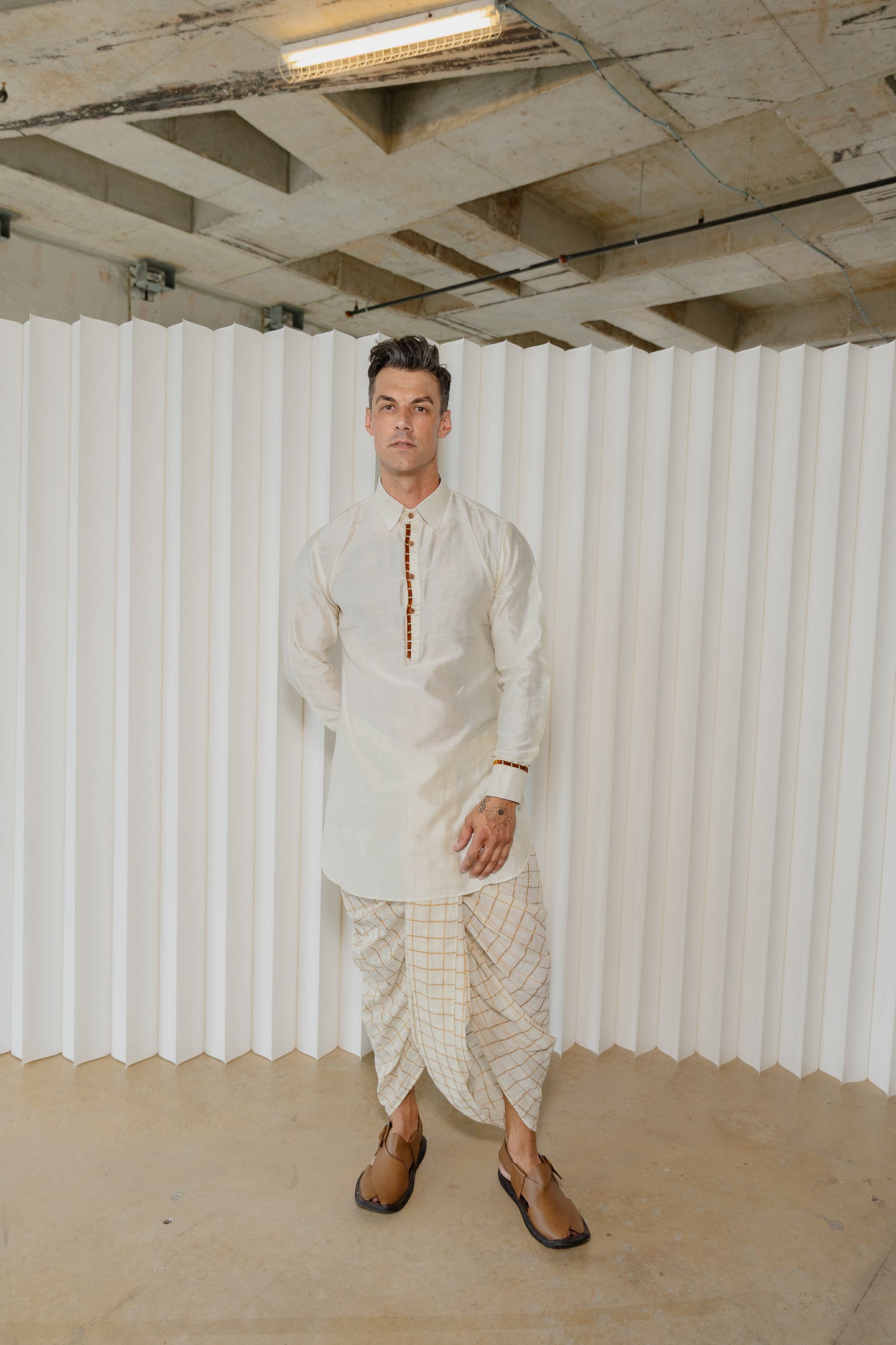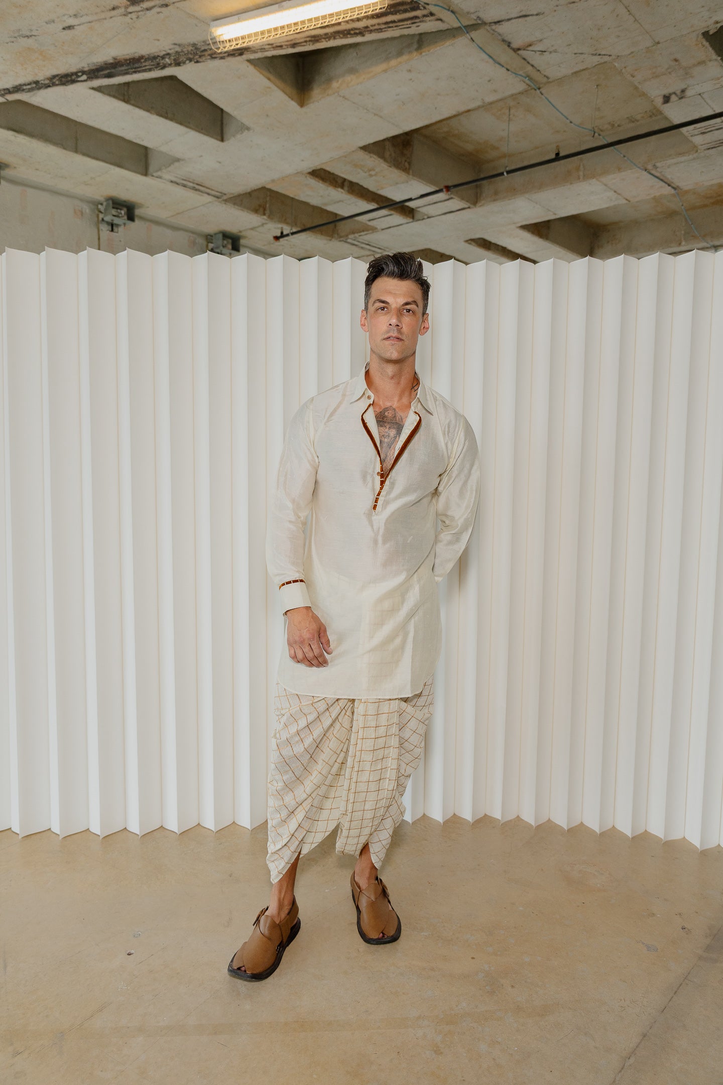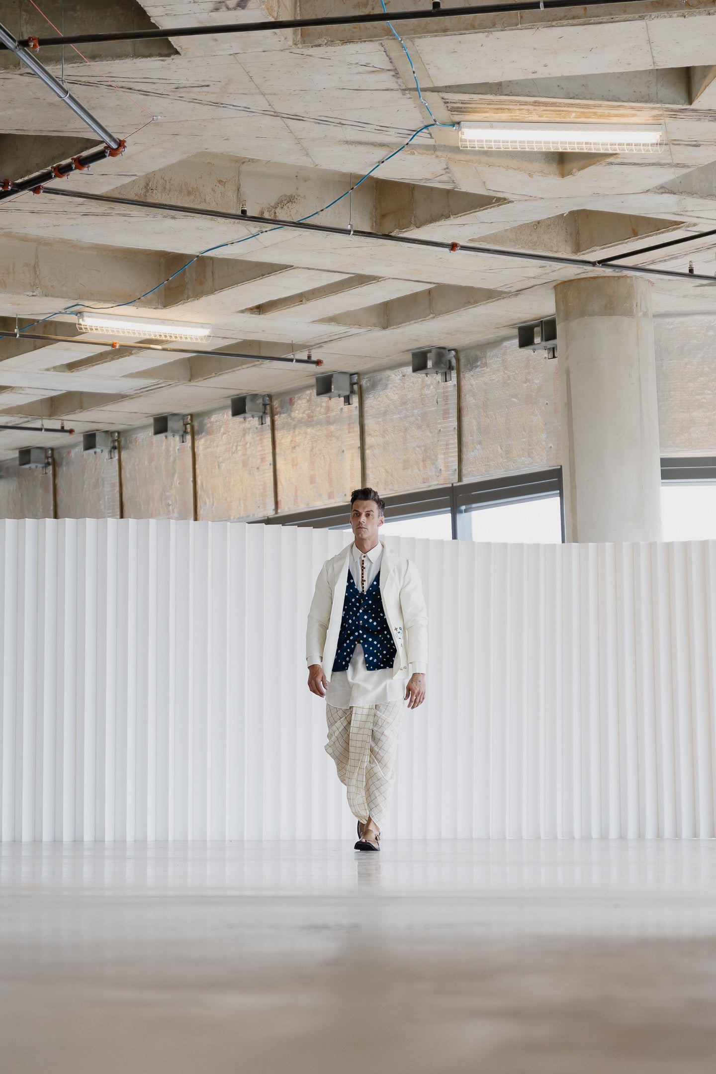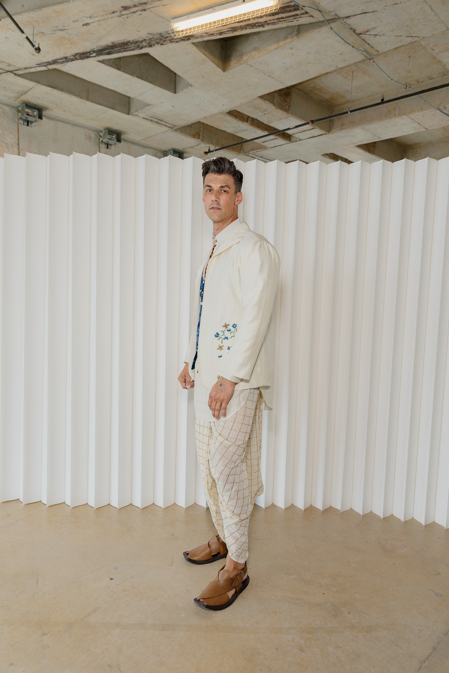 This 4 piece set is inspired by the Texas Bluebonnet flower. The embrodiered suit jacket is accents with a traditional bandhani vest and paired with a playful dhoti.
