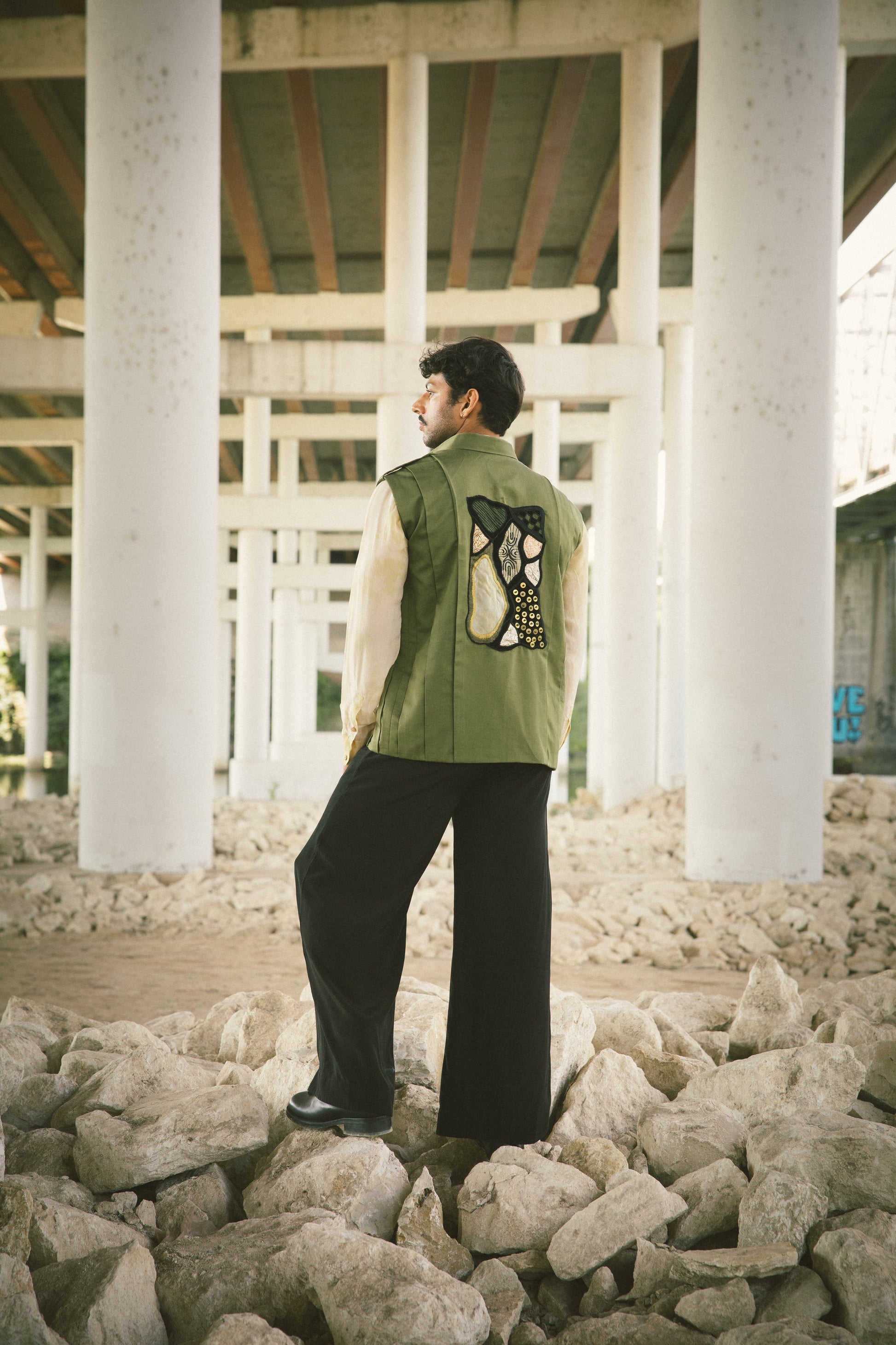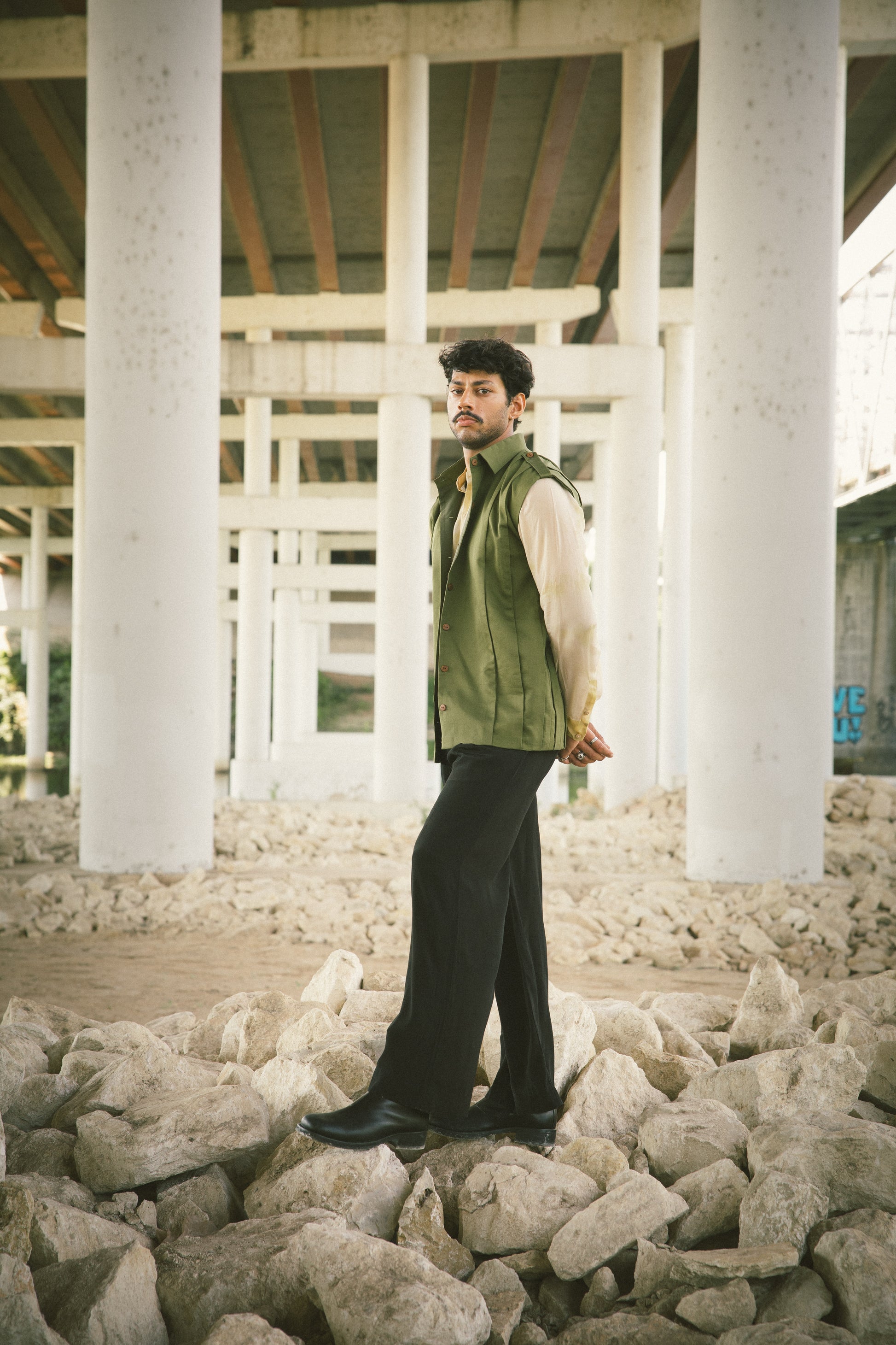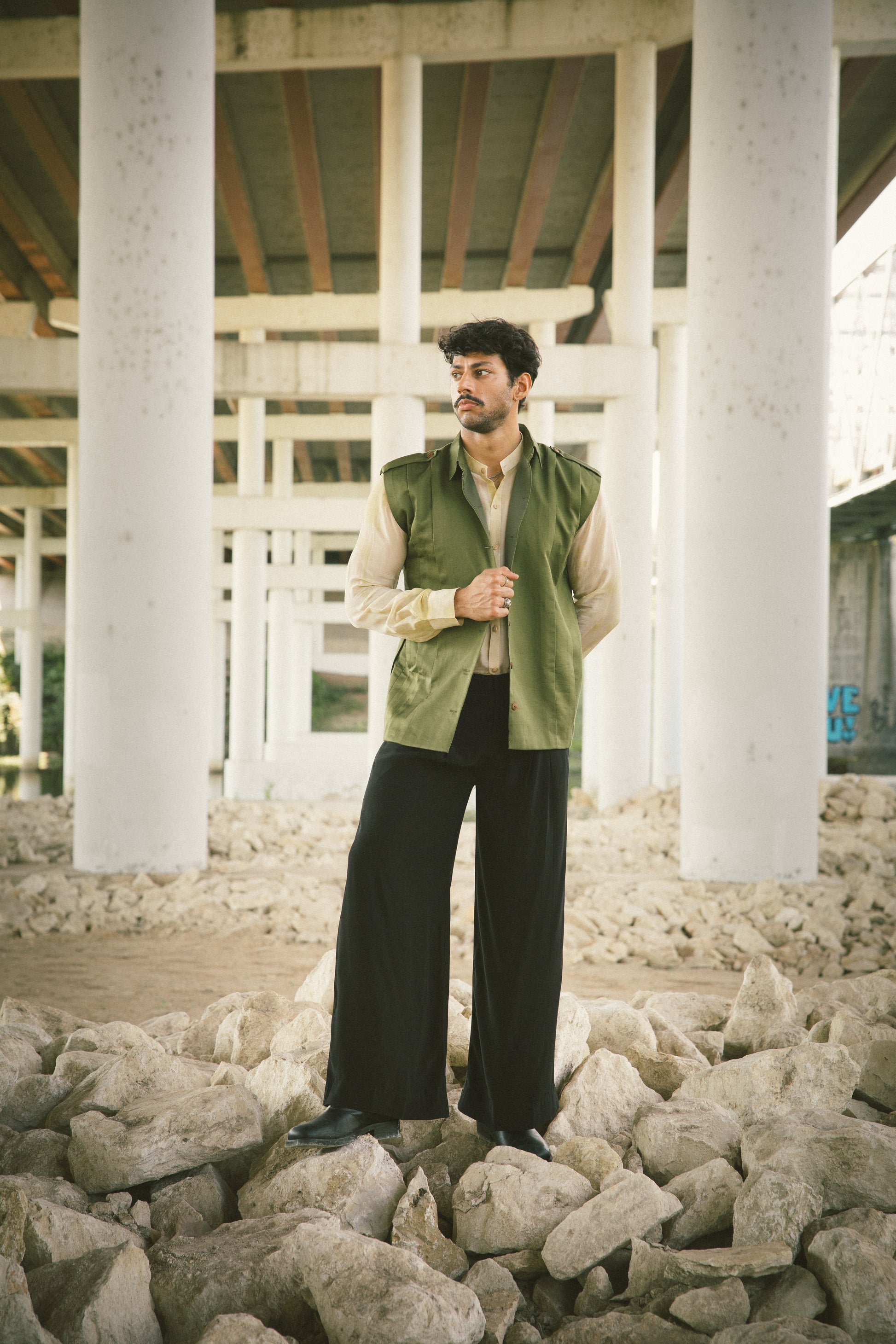 Structured olive green vest paired with pleated La Haveli signature pant and sheer tie-dye shirt.