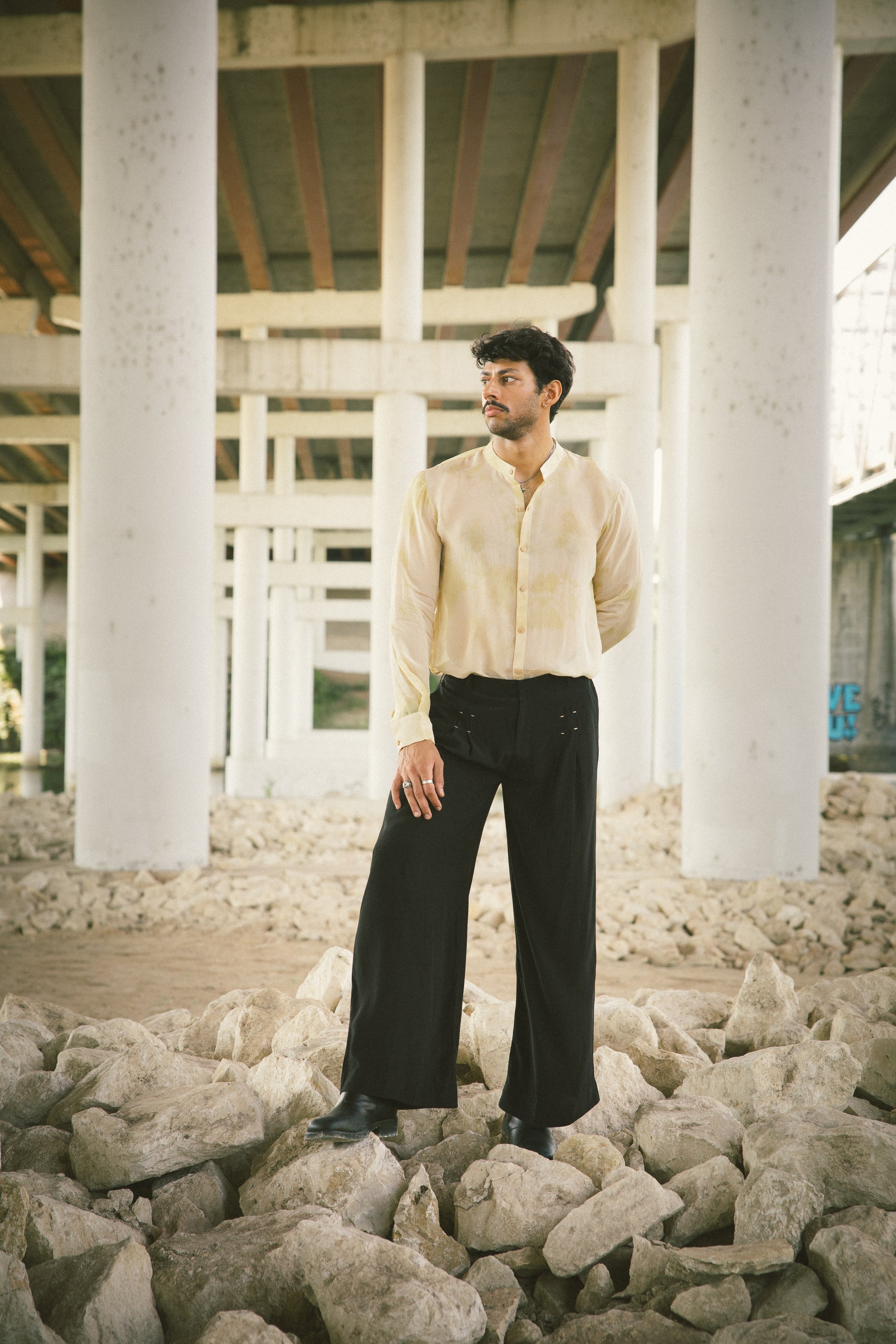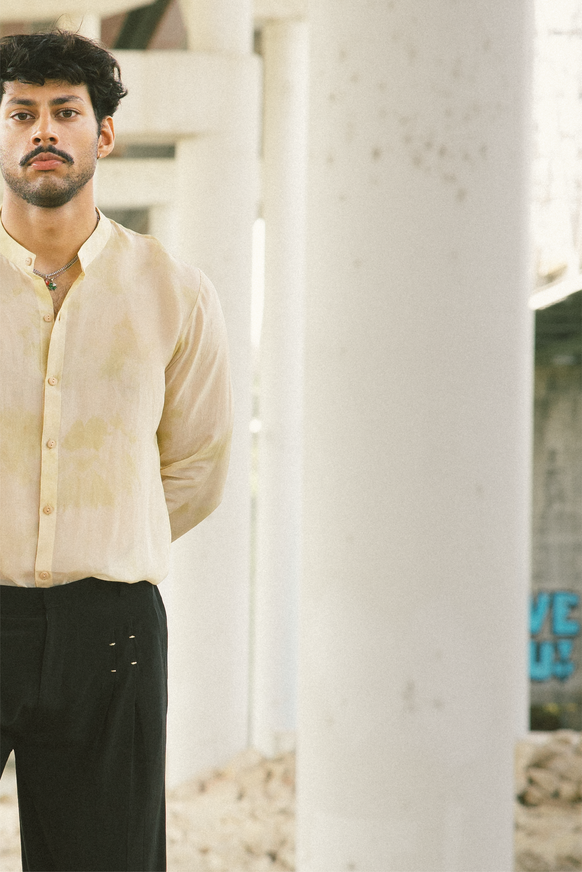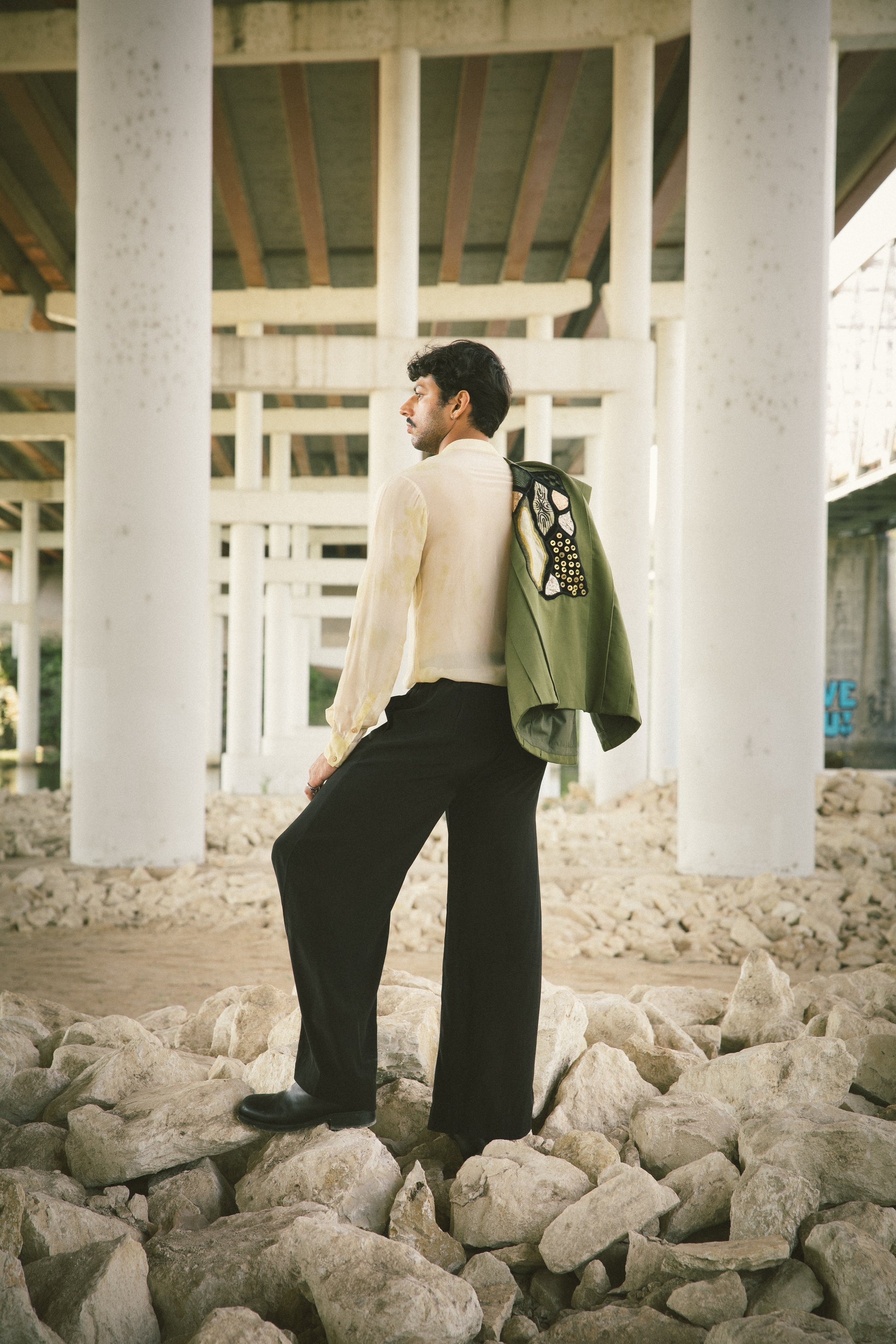 Structured olive green vest paired with pleated La Haveli signature pant and sheer tie-dye shirt.