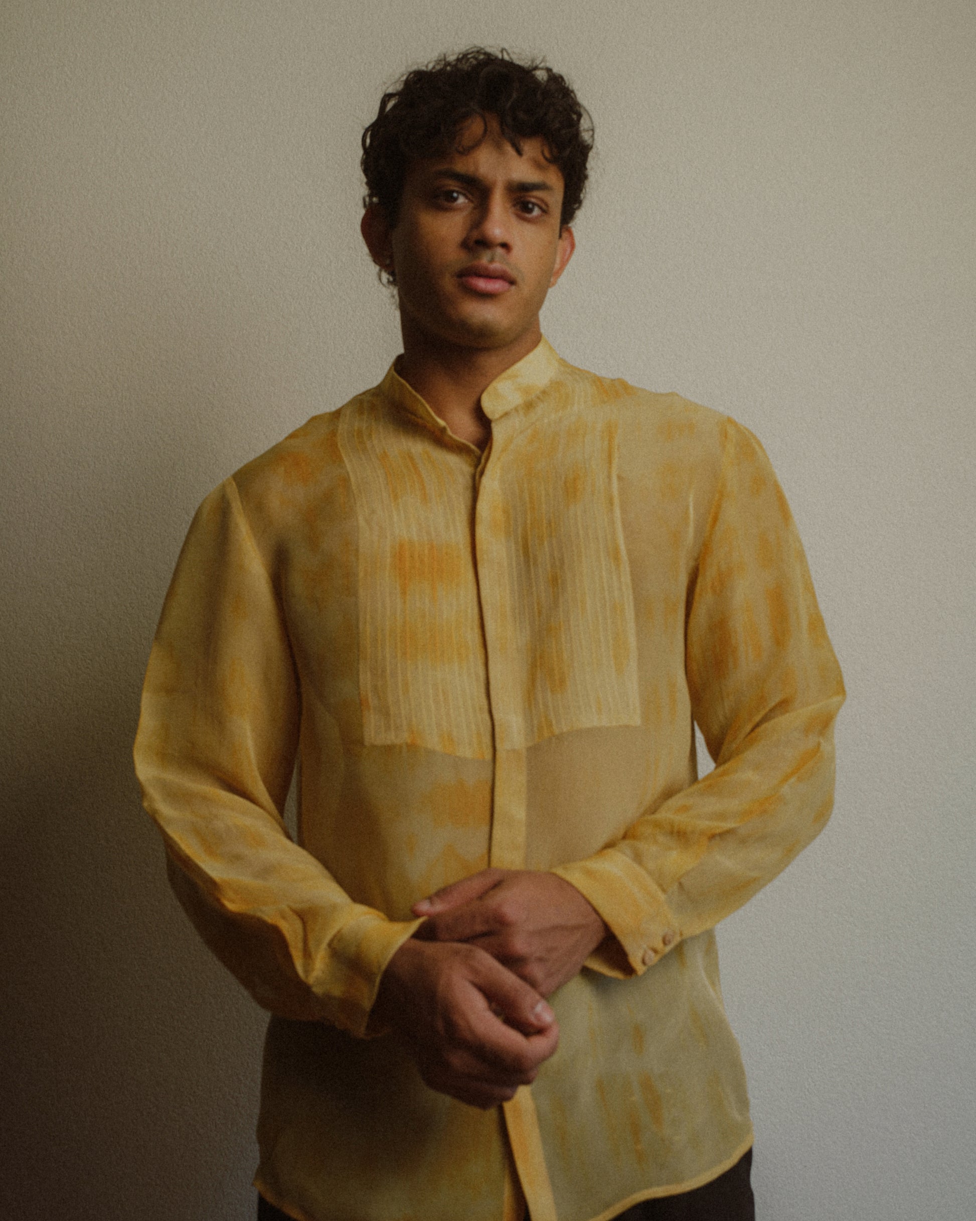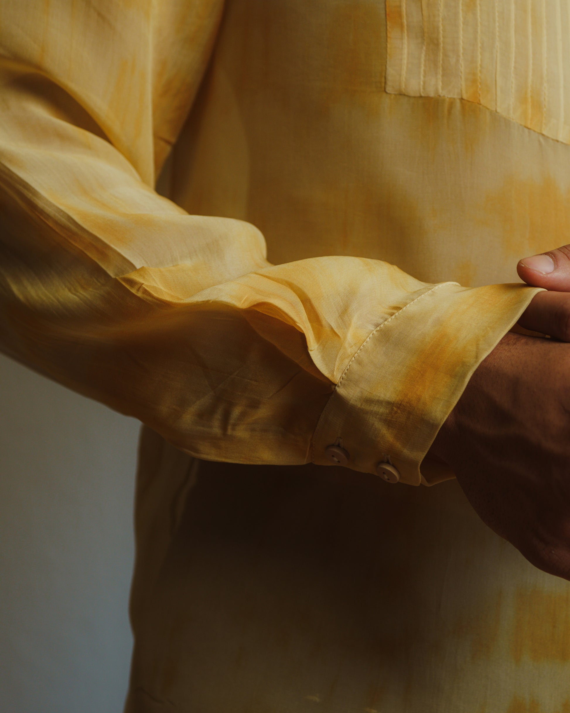 This shirt is inspired by the ritual and nostalgia of a drinking chai. Each shirt is hand dyed which allows for variations in the stains. The shirt is detailed with pleats and wooden buttons.