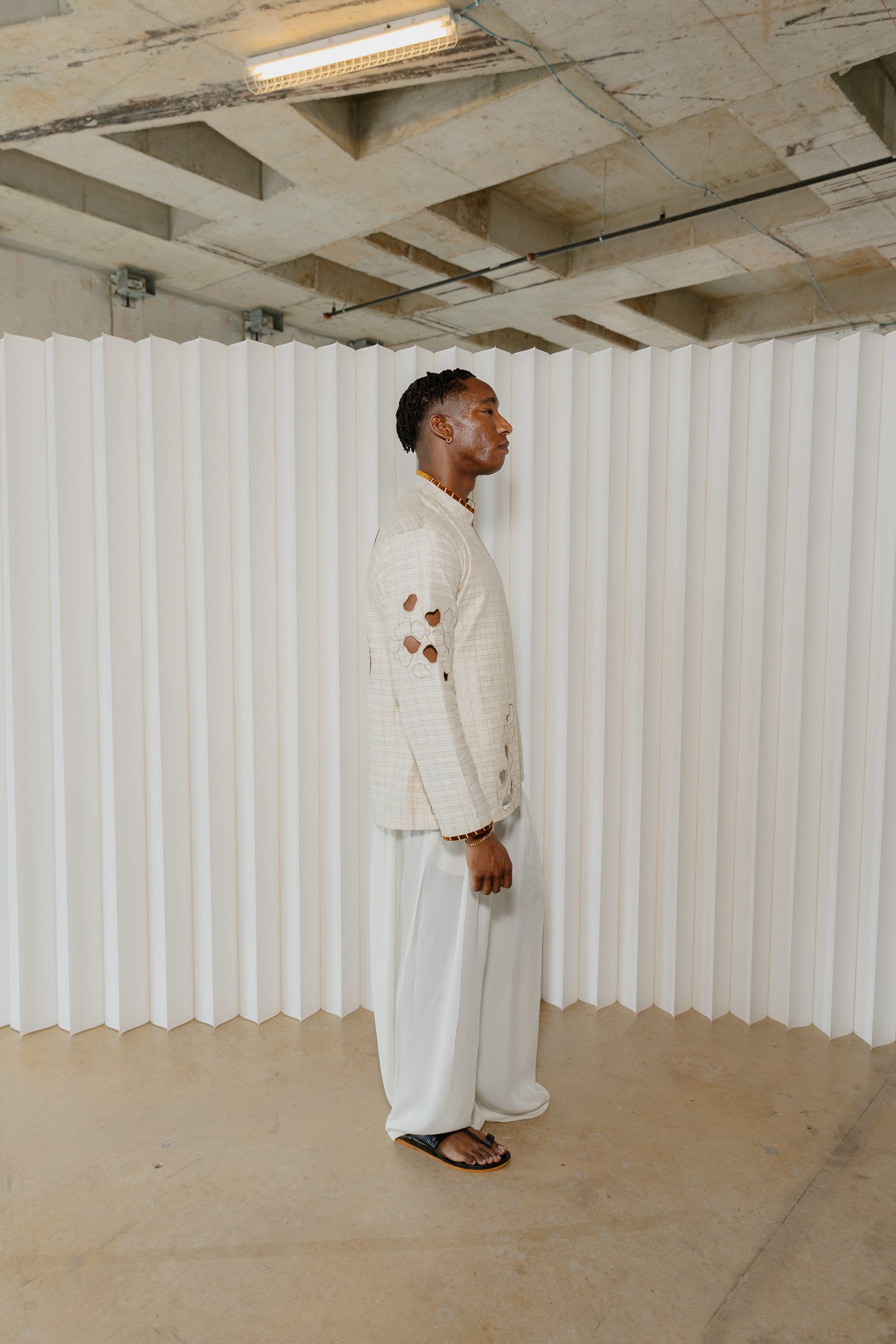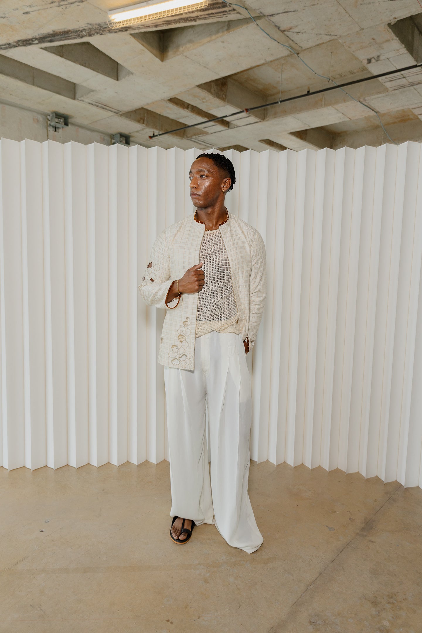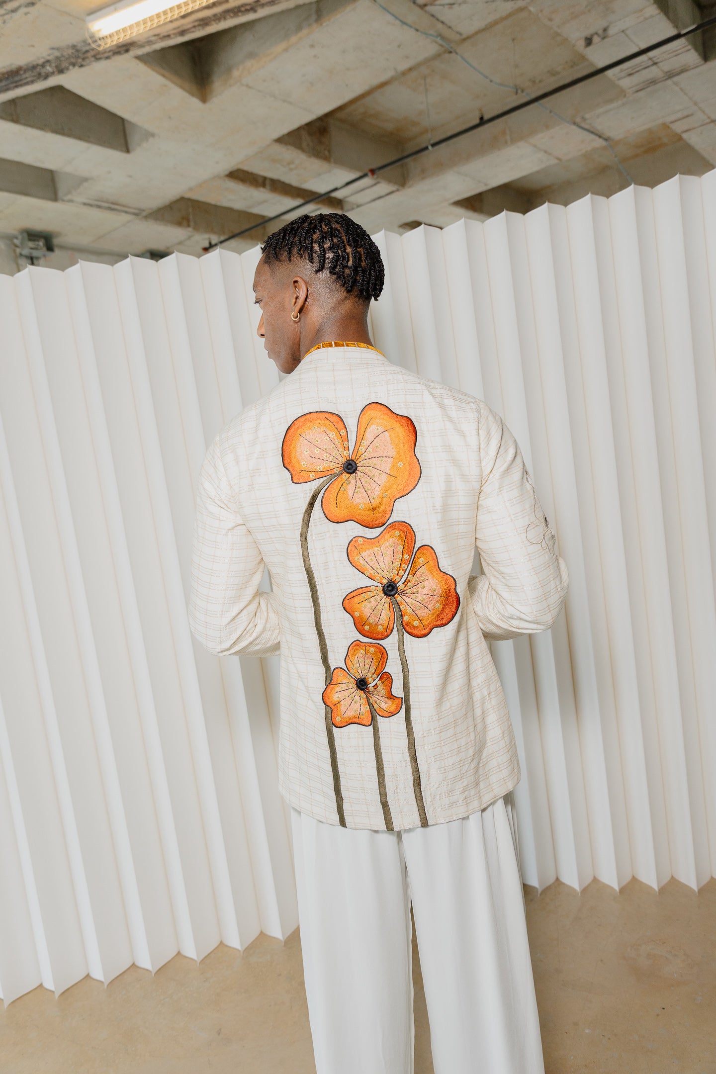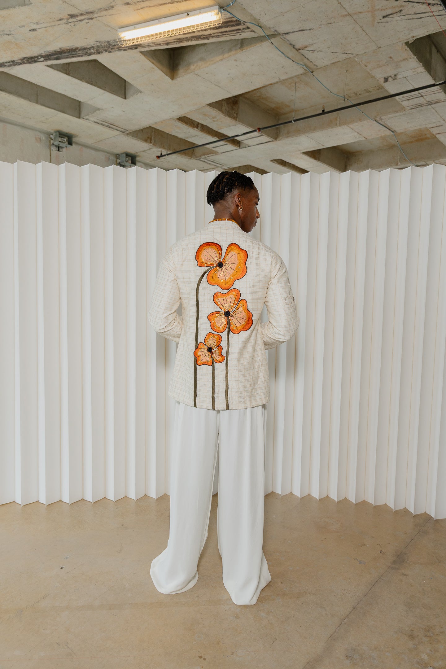 This 3 piece suit is inspired by the Coreopsis flower. The jacket is paired with a relax fit pants and a causual mesh tank.
