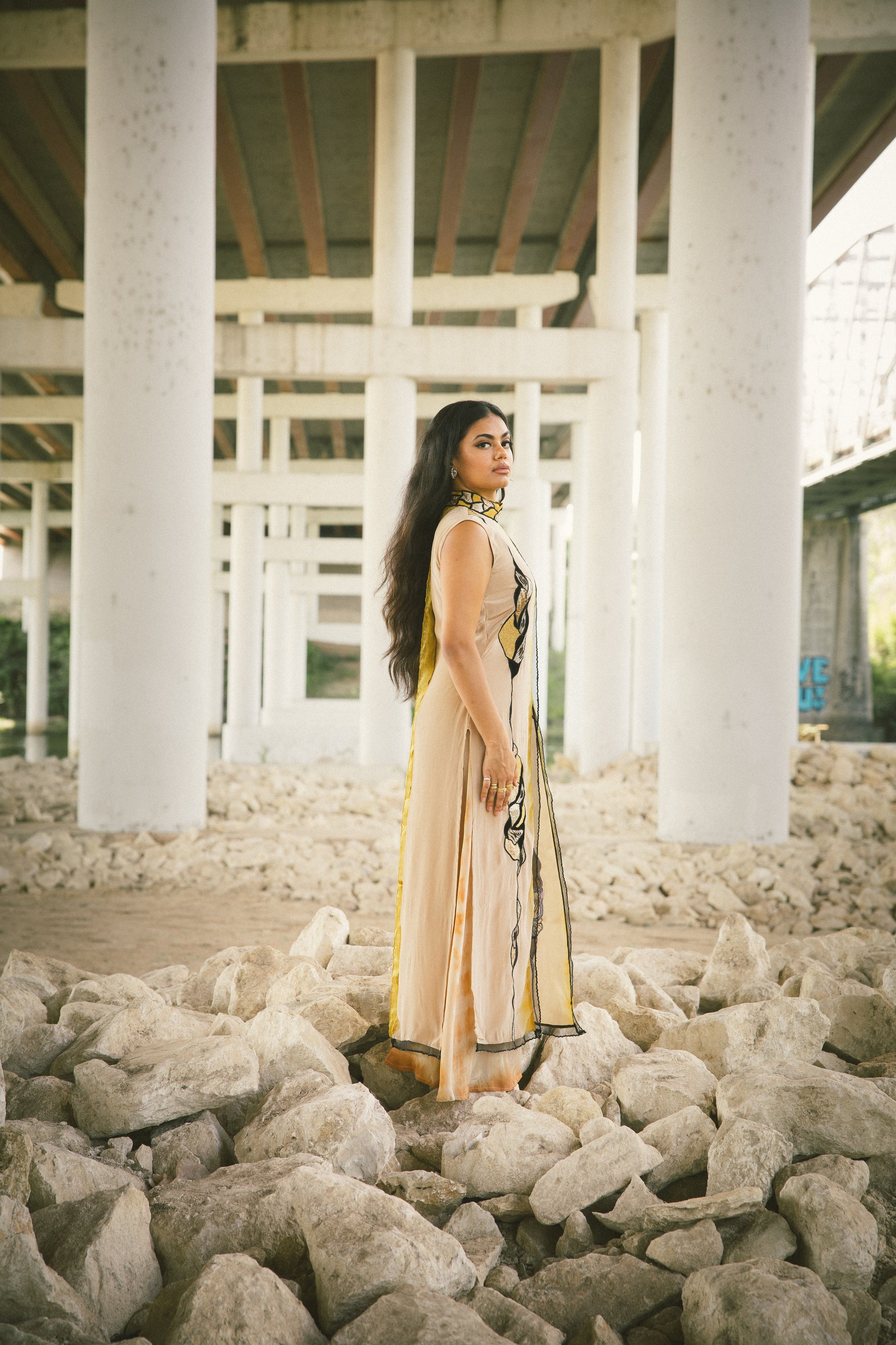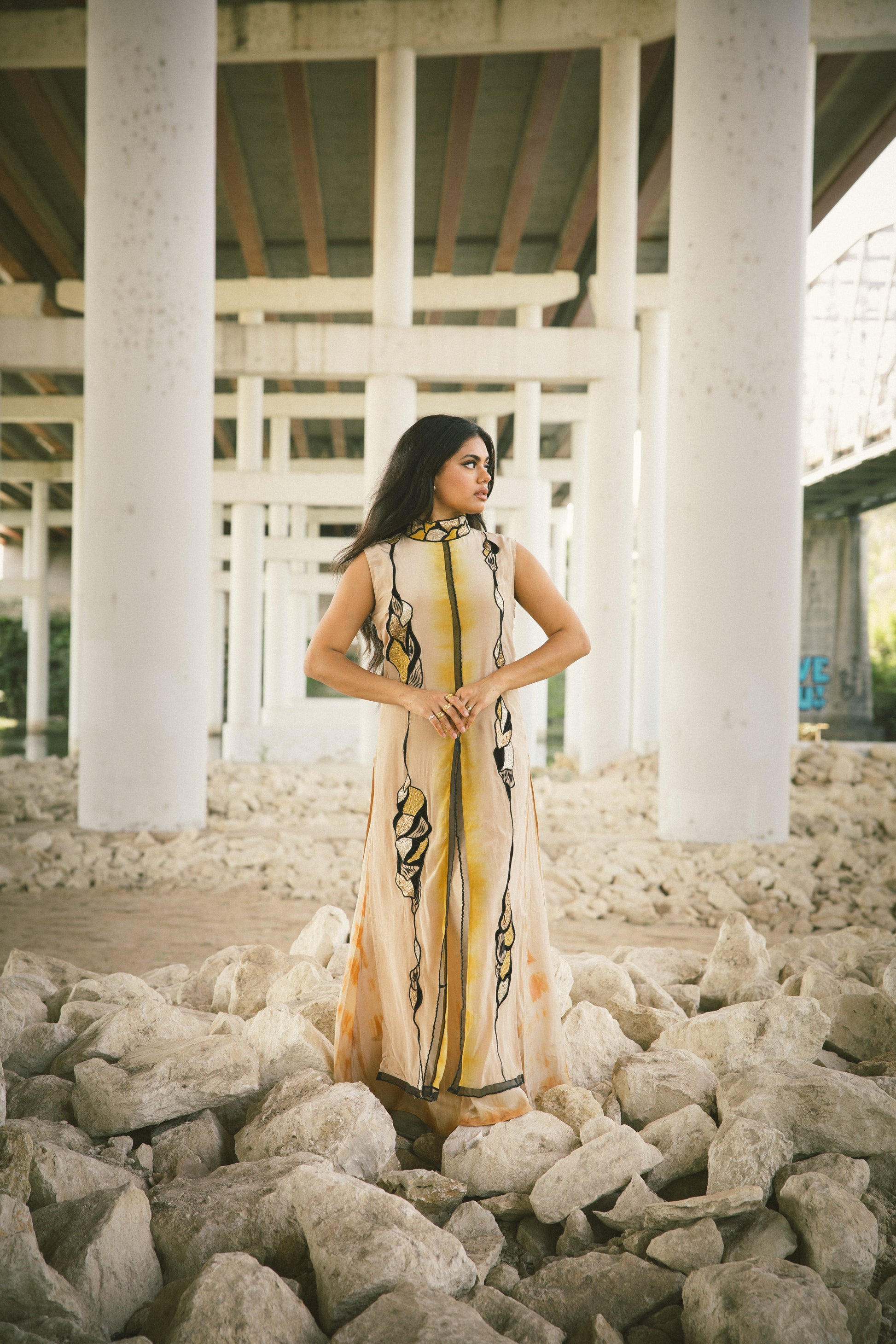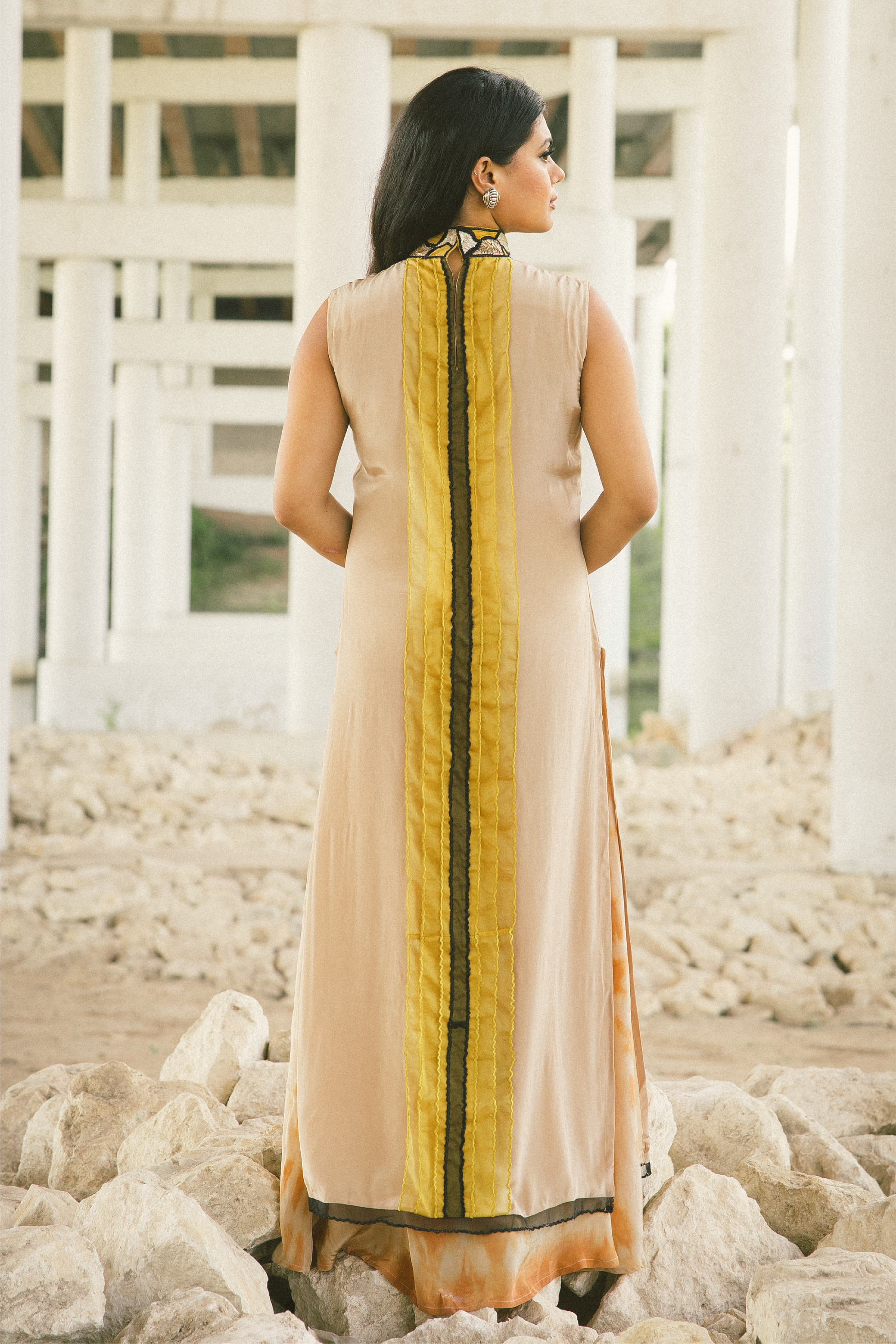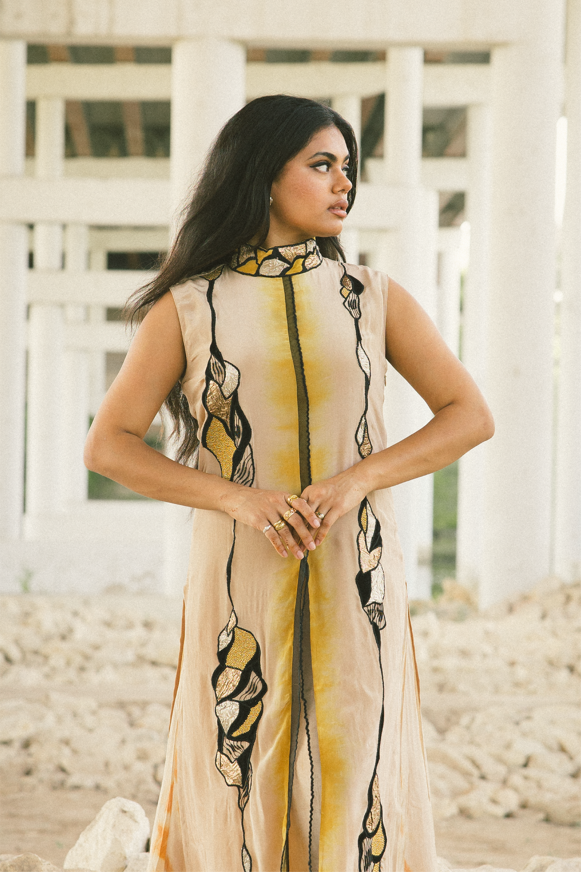 A flowing, full-length dress in a warm chai base, designed for ultimate comfort. It features delicate organza patch detailing and intricate mirror-like hand embroidery on the front. This elegant piece blends ease with exquisite craftsmanship for a standout look
