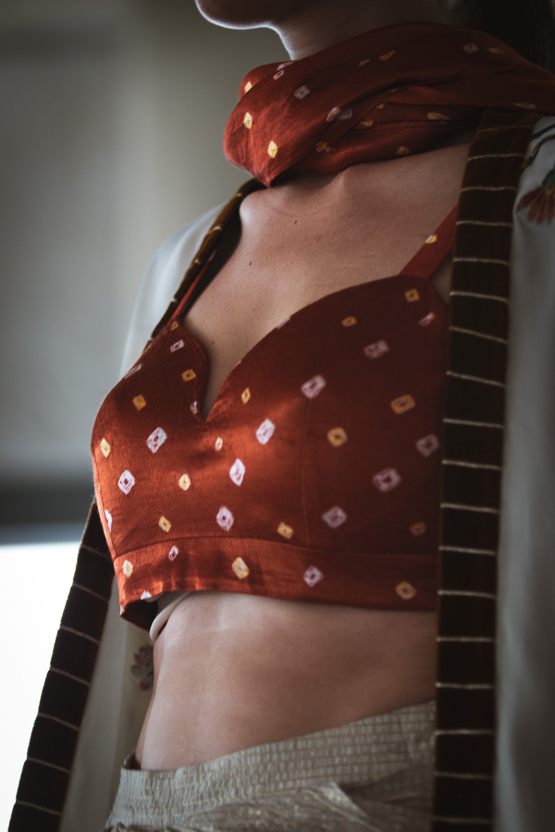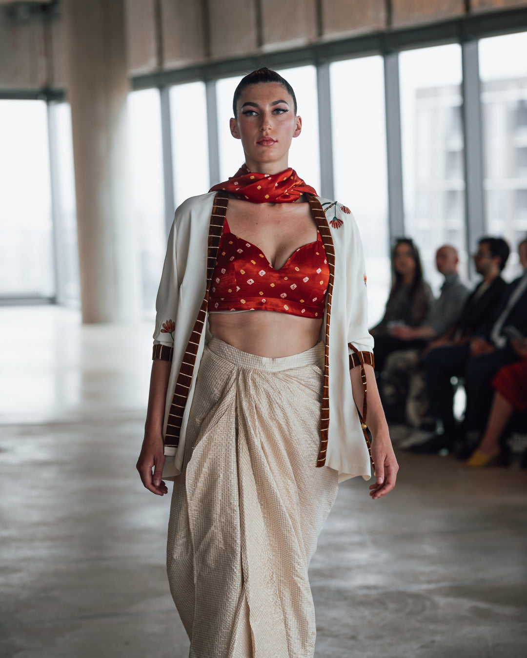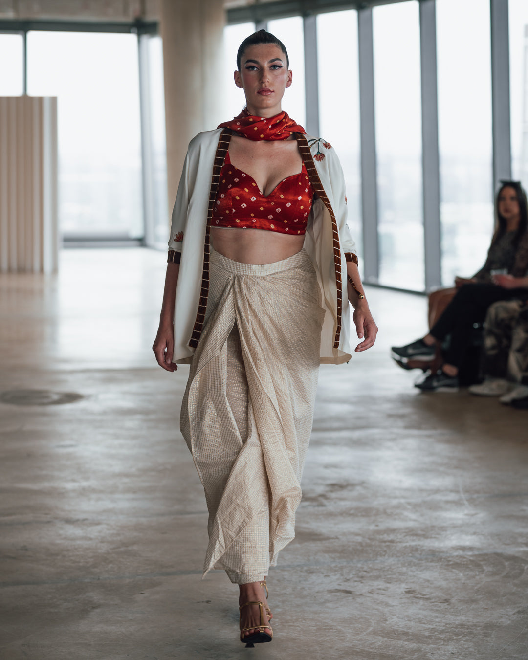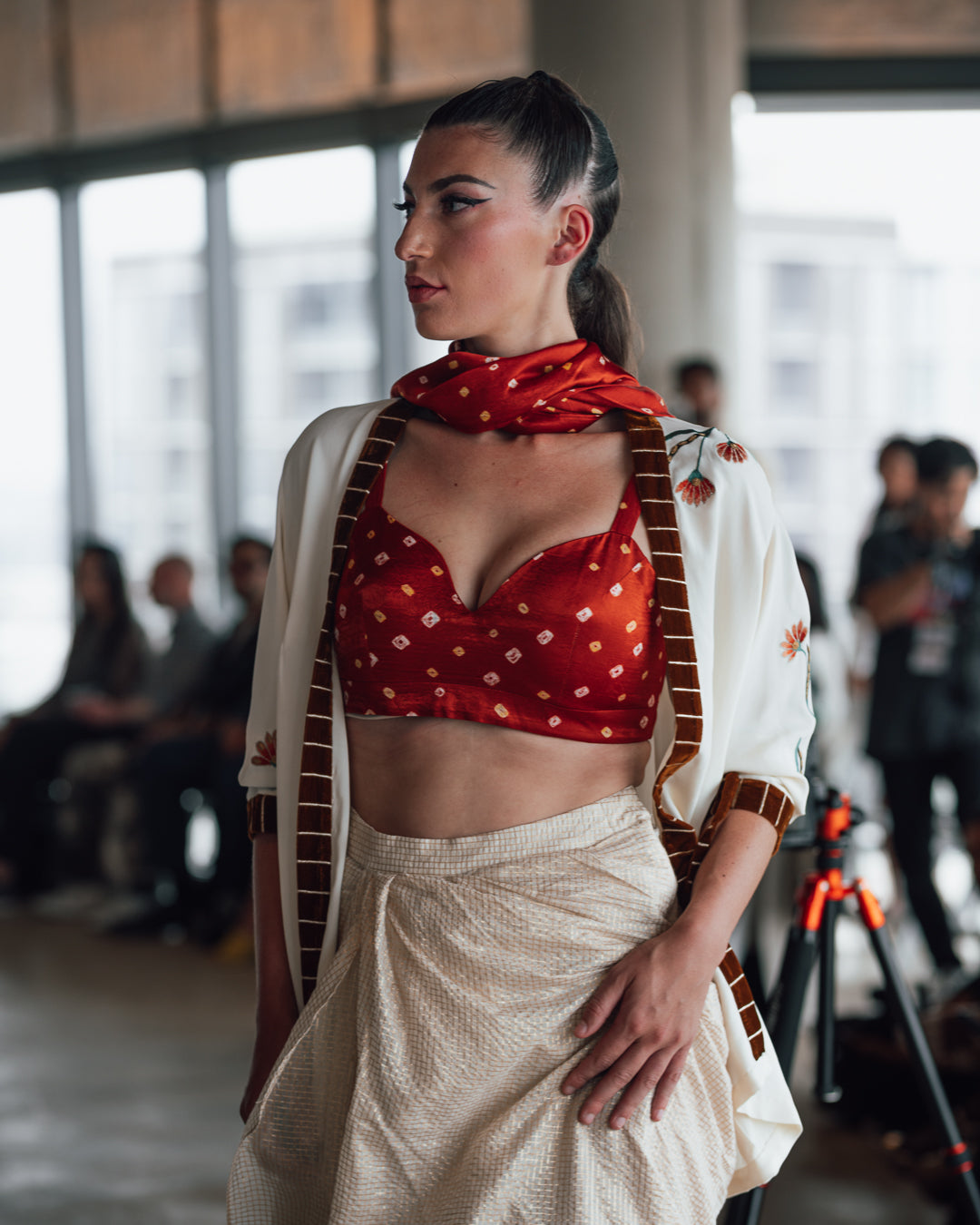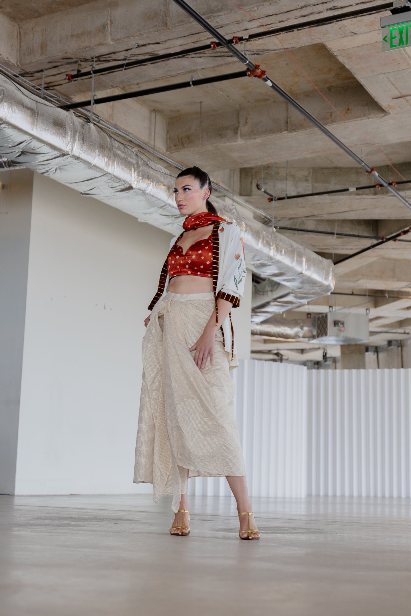 This 4 piece outfit is inspired by a wild flowers. The flowy kimono is paried with dhoti skirt and bold bandhani bralette.