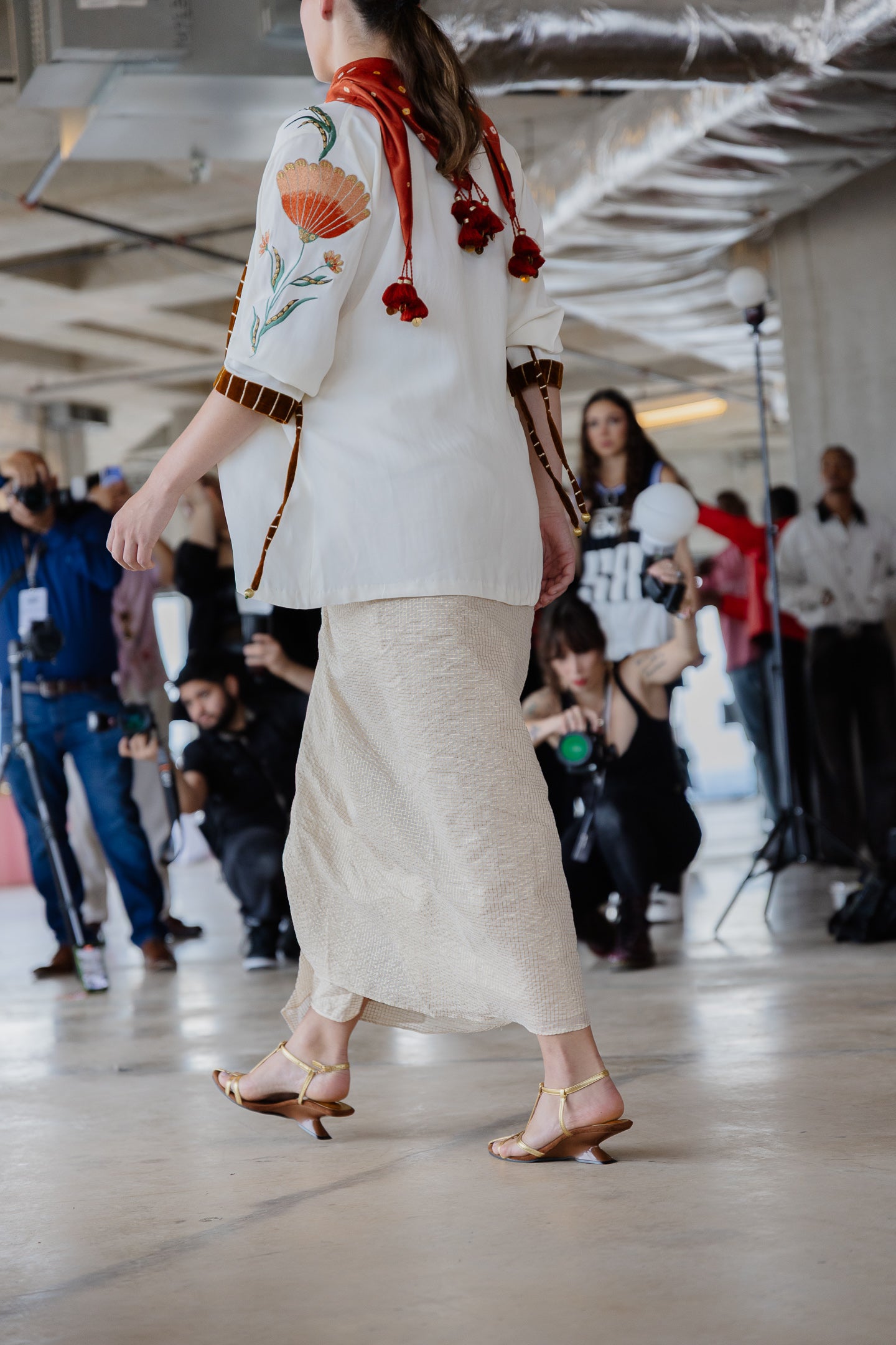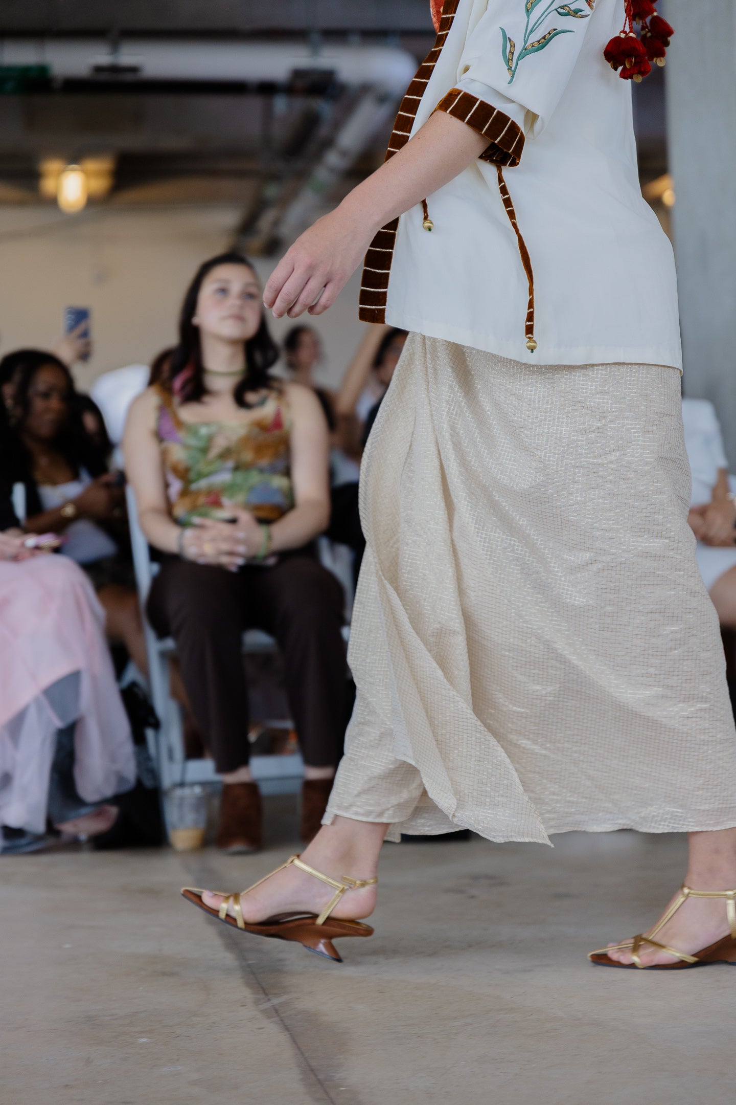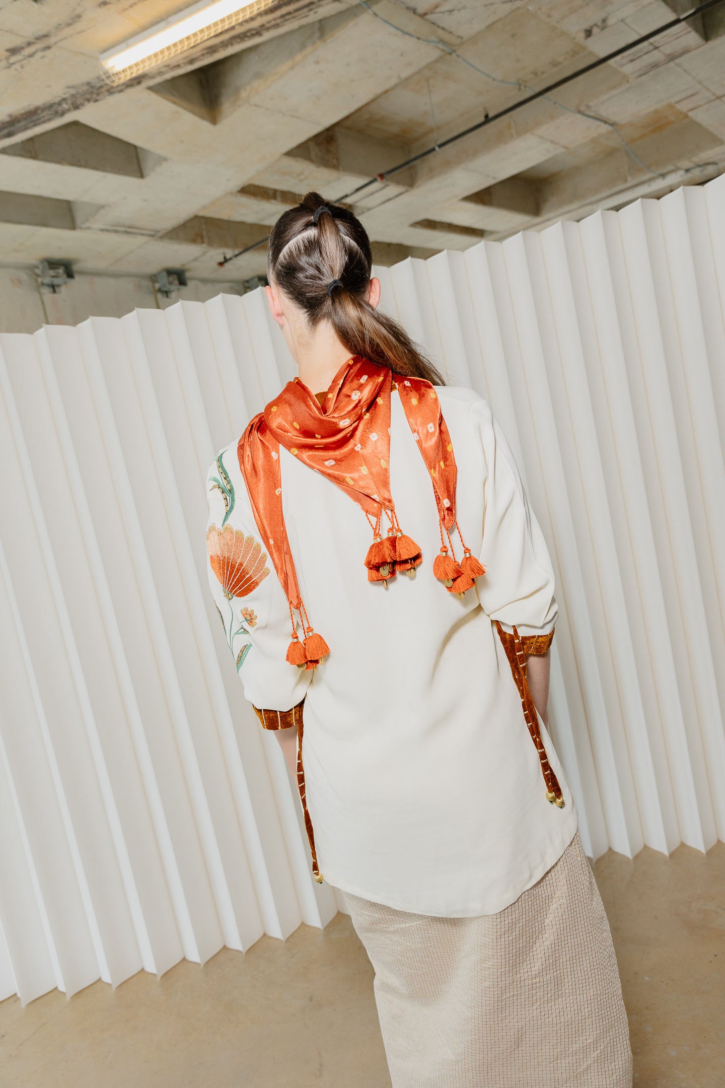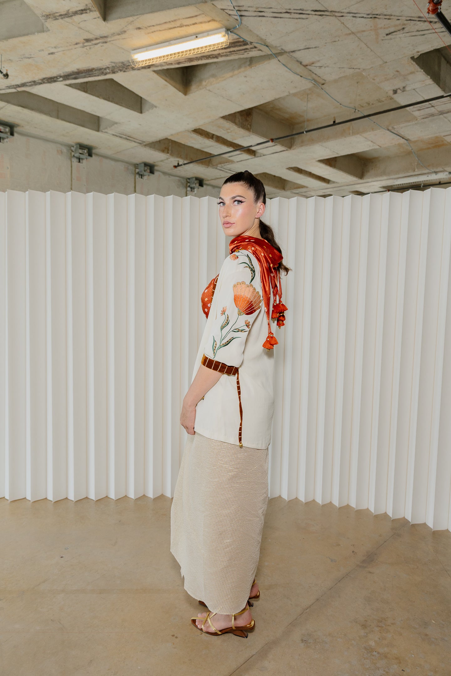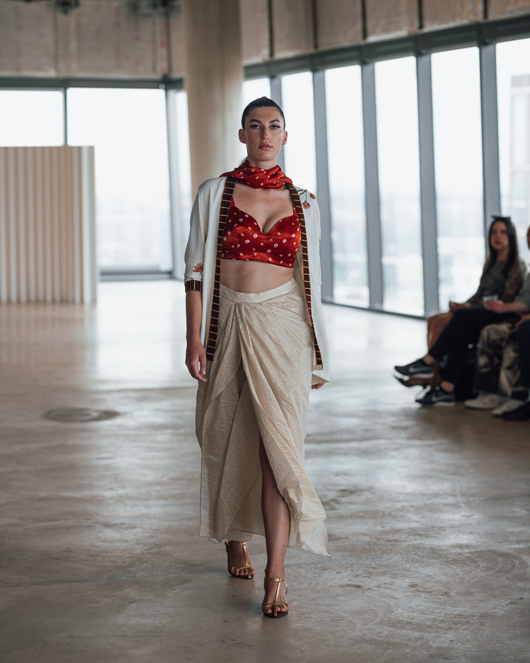 This 4 piece outfit is inspired by a wild flowers. The flowy kimono is paried with dhoti skirt and bold bandhani bralette.