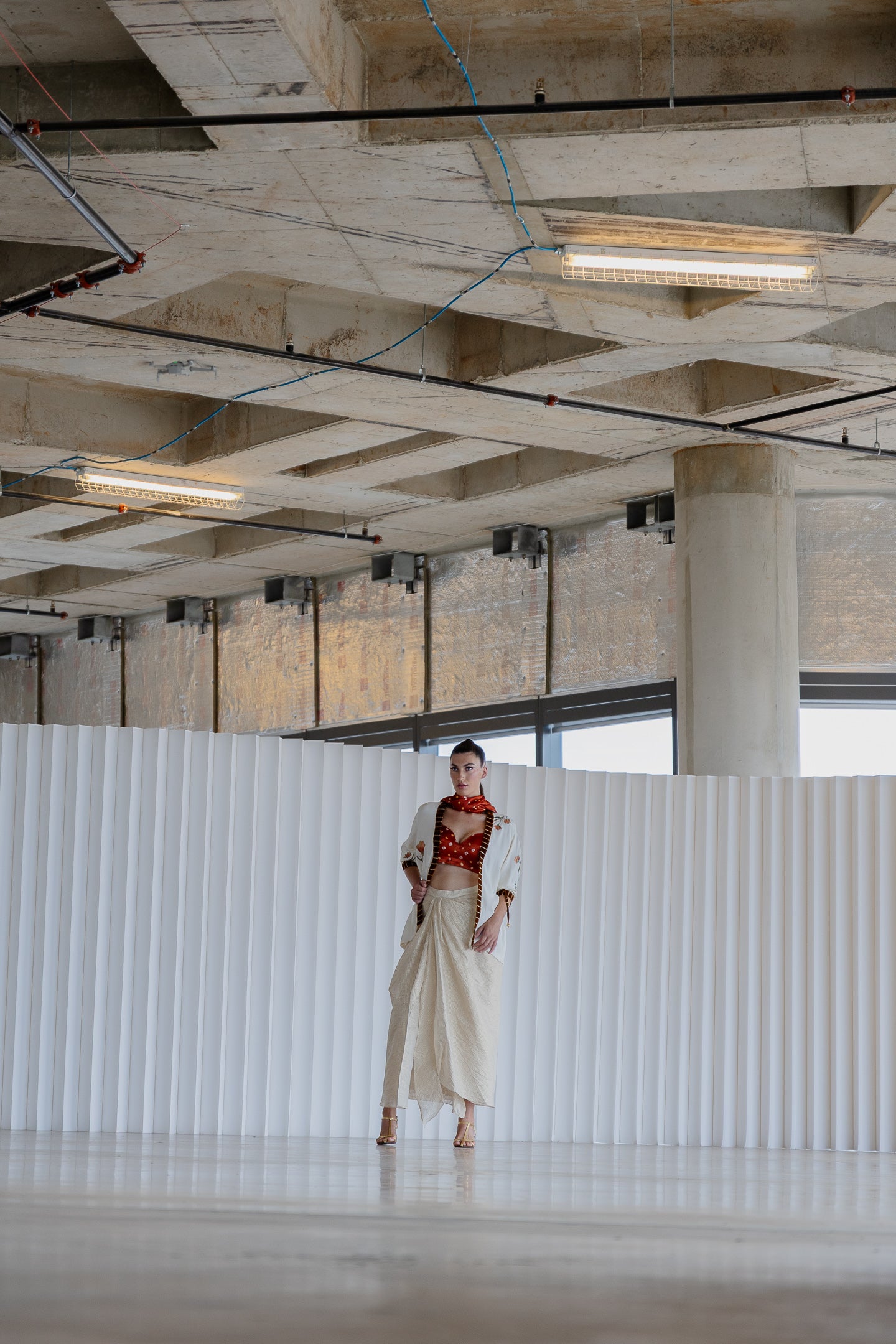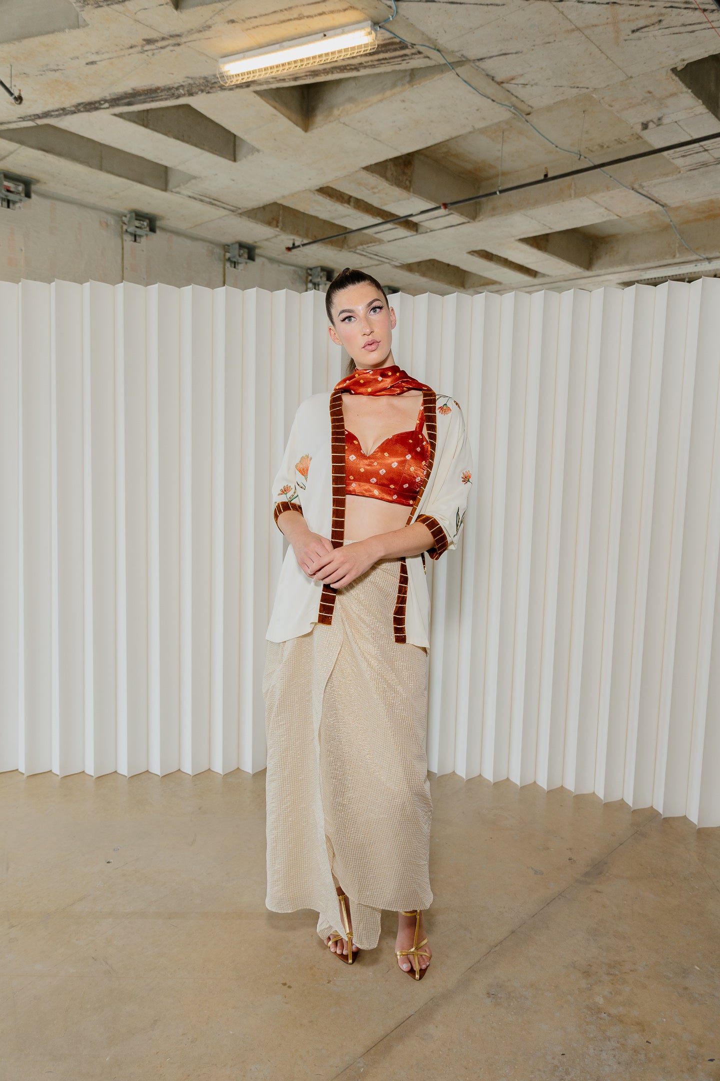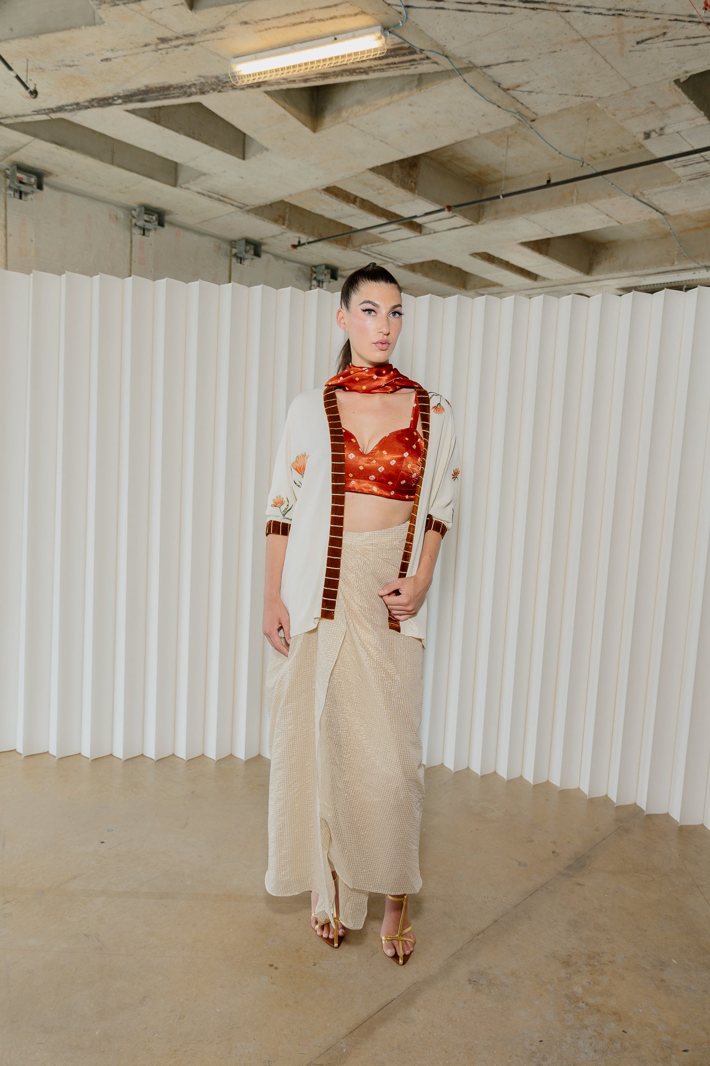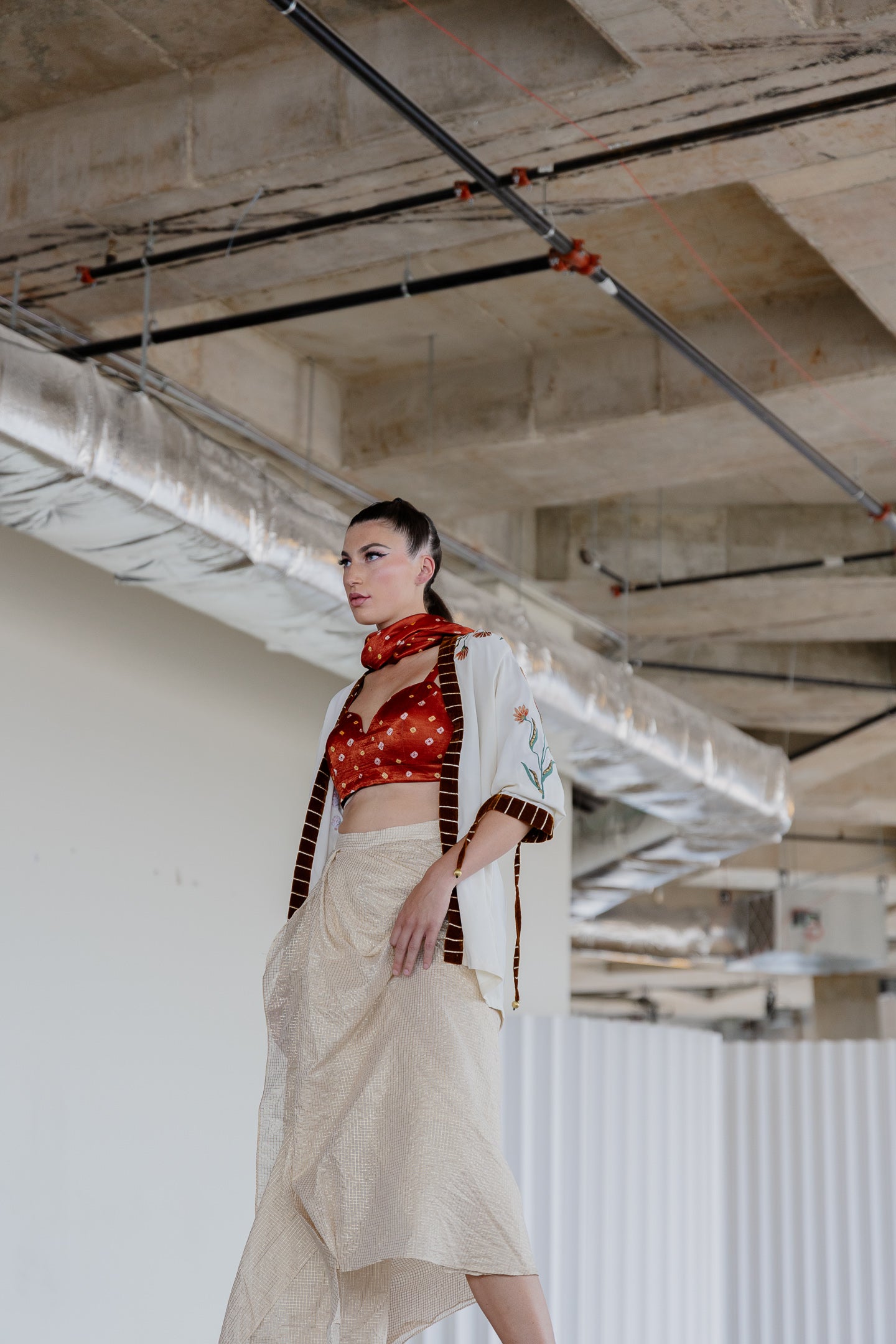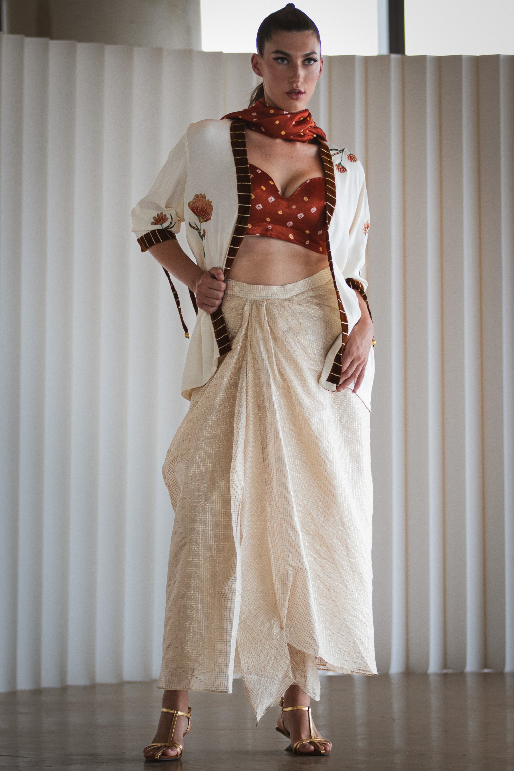 This 4 piece outfit is inspired by a wild flowers. The flowy kimono is paired with dhoti skirt and bold bandhani bralette.